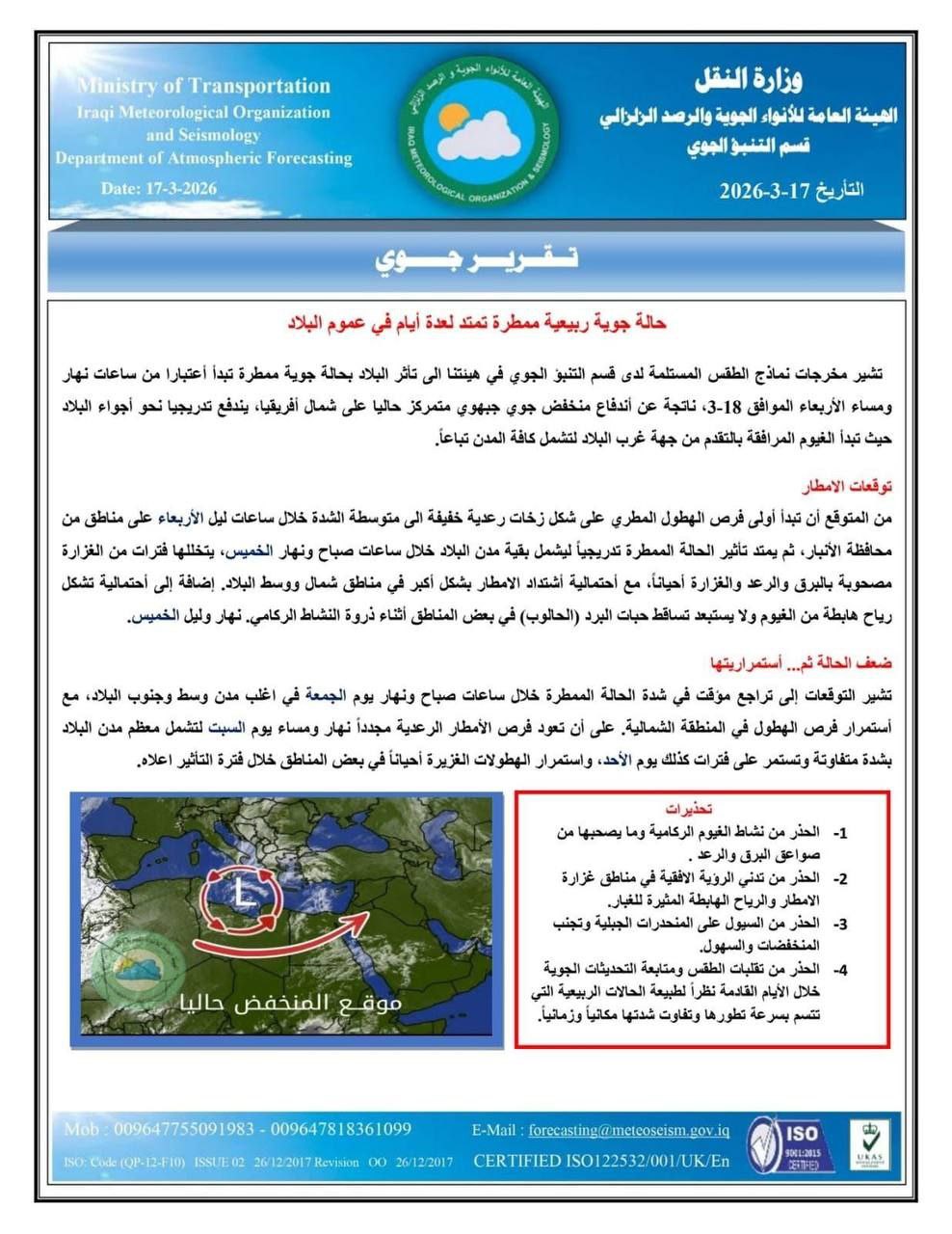 محلياتالأنواء الجوية: العراق يتأثر بحالة ممطرة ابتداءً من يوم غد الأربعاء لغاية الإثنين المقبل قبل ساعتين 10 مشاهدات شارك الوسومالأنواء الجويةالعراققد يهمك أيضا سياسة حكومة اقليم كردستان تعلن تفاصيل الاتفاق مع بغداد بشأن تصدير النفط عبر تركيا قبل 32 دقيقة 5 مشاهدات عربي ودولي ايران تعلن اغتيال أمين المجلس الأعلى للأمن القومي “علي لاريجاني” قبل 54 دقيقة 9 مشاهدات أمن فصائل المقاومة تعلن تنفيذ 47 عملية ضد القواعد الامريكية في العراق والمنطقة قبل 59 دقيقة 8 مشاهدات الاخبار العاجلة المبعوث الامريكي: الولايات المتحدة تدعم اتفاق تصدير النفط بين بغداد وأربيل قبل ساعة واحدة 9 مشاهدات أمن ادارة “الرشيد” تنفي وجود أي قوات أمريكية متمركزة داخل الفندق قبل ساعتين 8 مشاهدات