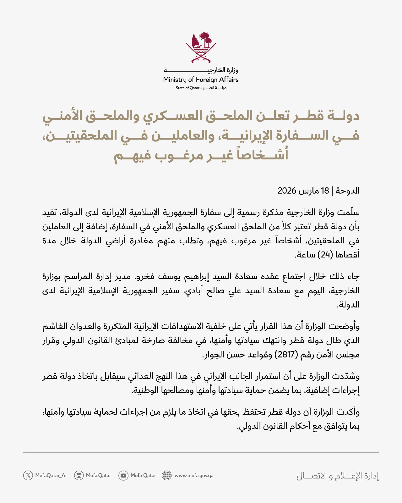 عربي ودوليالخارجية القطرية تبلغ الملحقين العسكري والأمني بسفارة إيران بأنهم أشخاص غير مرغوب بهم قبل ساعتين 9 مشاهدات شارك الخارجية القطرية: ضرورة الوقف الفوري للتصعيد والعودة إلى طاولة المفاوضات الوسومإيرانالخارجية القطريةقد يهمك أيضا الاخبار العاجلة ثلاث مسيرات تستهدف القاعدة العسكرية في ام قصر بمحافظة البصرة قبل 29 دقيقة 11 مشاهدات أمن كتائب حزب الله تقرر ايقاف استهداف السفارة الامريكية في بغداد لمدة خمسة ايام وتضع عدة شروط قبل 37 دقيقة 15 مشاهدات سياسة العراق يدين استهداف منشآت الطاقة في حقلِ بارس بإيران قبل 49 دقيقة 7 مشاهدات أمن رئيس البرلمان يؤكد دعمه لجهود وزارة الداخلية في عدم التهاون مع محاولات العبث بالأمن والاستقرار قبل ساعة واحدة 7 مشاهدات عربي ودولي قطر تطلب من الملحقين العسكري والأمني بسفارة إيران مغادرة أراضيها خلال 24 ساعة قبل ساعتين 8 مشاهدات