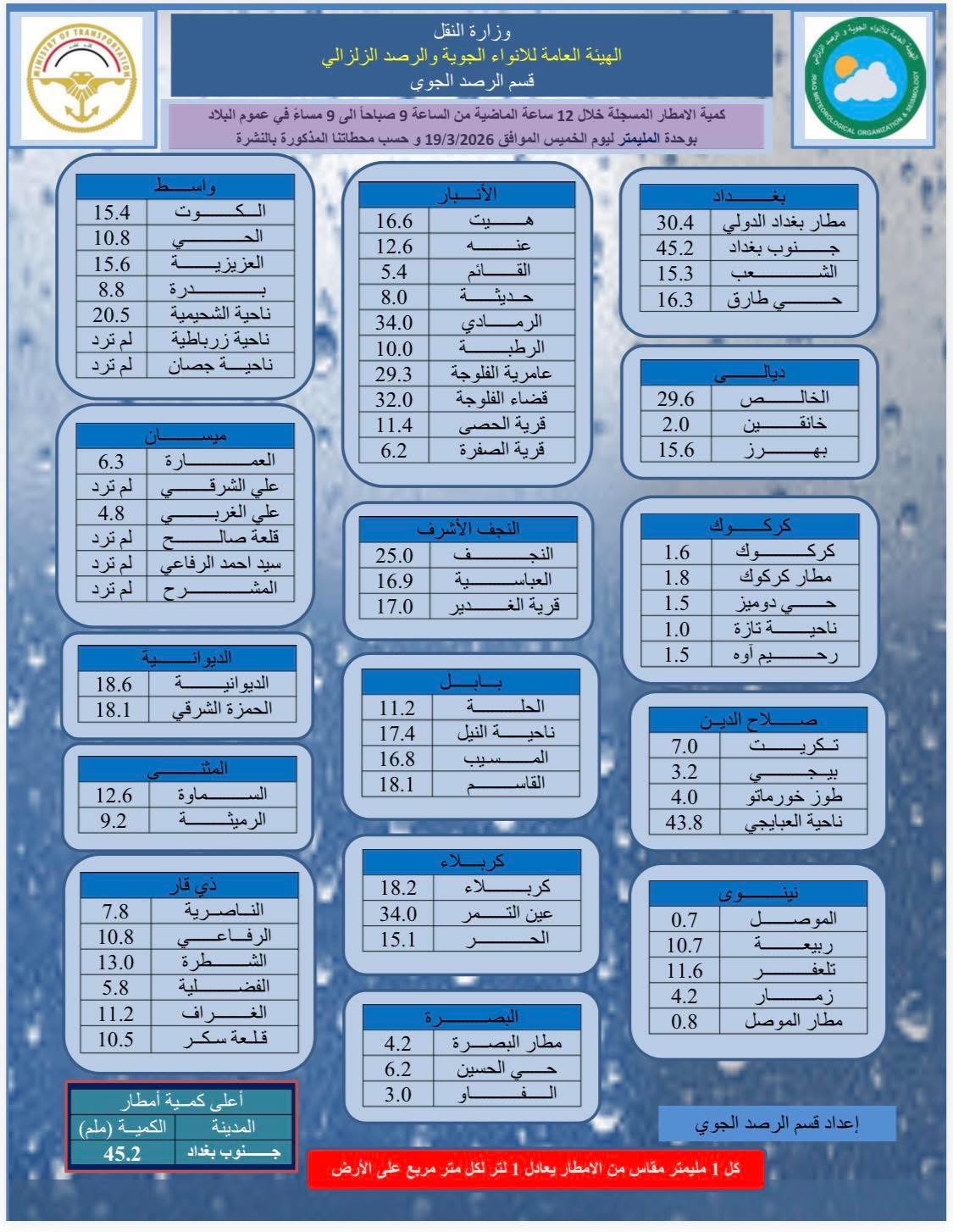 محلياتالأنواء الجوية تنشر كميات الأمطار المتساقطة في عموم العراق قبل ساعتين 7 مشاهدات شارك الأنواء الجوية تنشر كميات الأمطار المتساقطة في عموم العراق الوسومالأمطارالأنواء الجويةالعراققد يهمك أيضا أمن الحشد الشعبي: الاعتداء على مقرات العمليات في الانبار والموصل انتهاك خطير لسيادة العراق قبل 35 دقيقة 5 مشاهدات محليات الأنواء الجوية: استمرار هطول الأمطار لغاية الإثنين المقبل قبل ساعة واحدة 8 مشاهدات عربي ودولي نتنياهو: دمرنا كامل الأسطول الإيراني في بحر قزوين قبل ساعة واحدة 5 مشاهدات عربي ودولي نتنياهو: إيران لم تعد قادرة على إنتاج اليورانيوم أو الصواريخ الباليستية قبل ساعة واحدة 8 مشاهدات عربي ودولي واشنطن توافق على صفقات أسلحة بقيمة 16.5 مليار دولار لثلاث دول عربية قبل ساعة واحدة 8 مشاهدات