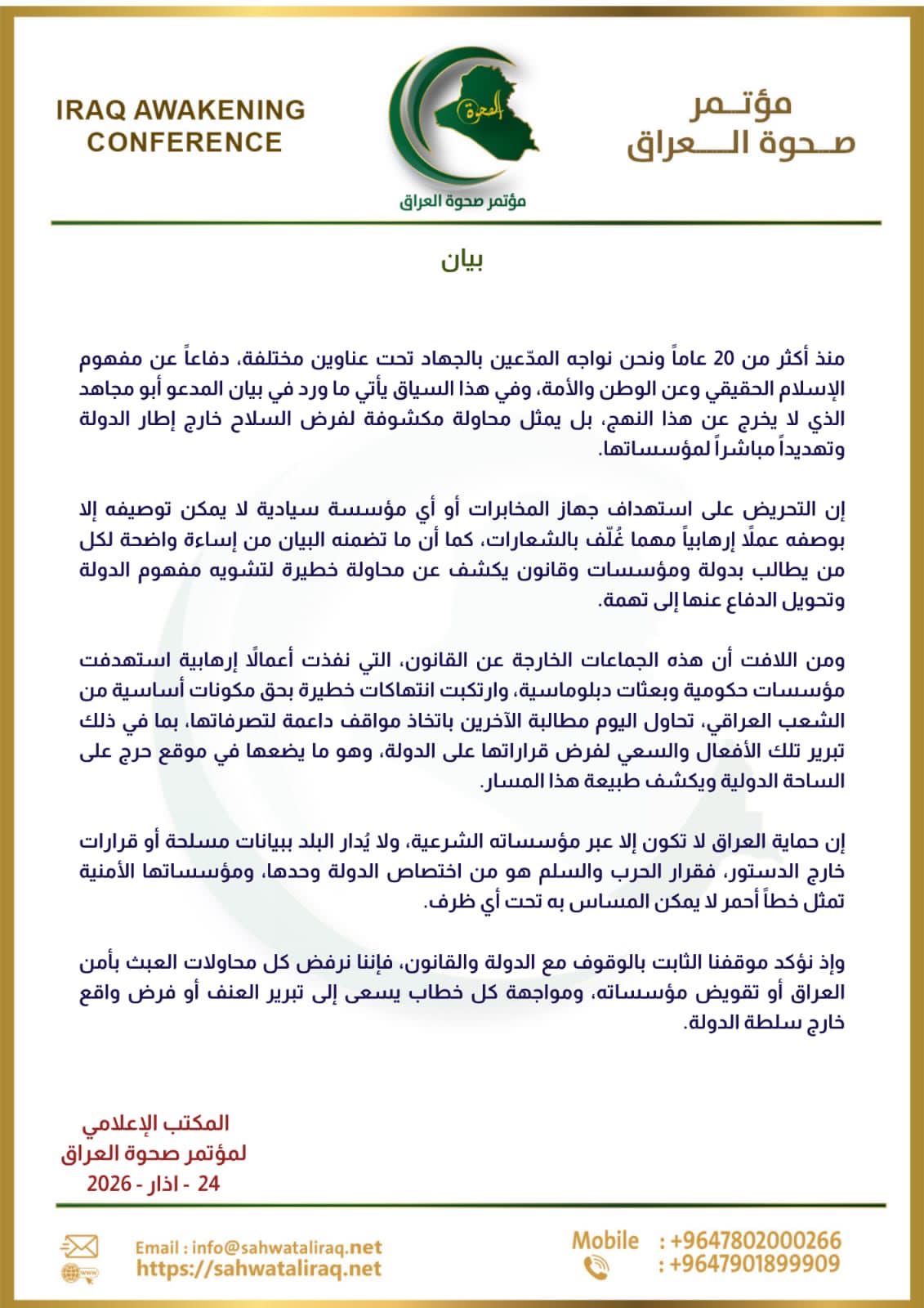 سياسةمؤتمر صحوة العراق: التحريض على استهداف جهاز المخابرات او أي مؤسسة سيادية عمل ارهابي قبل ساعتين 8 مشاهدات شارك الوسومارهابياستهدافالتحريضجهاز المخابراتمؤتمر صحوة العراققد يهمك أيضا أمن قصف يستهدف مقرًا للحشد الشعبي في الانبار قبل ساعة واحدة 15 مشاهدات أمن قصف يستهدف مقرًا للحشد الشعبي في جرف الصخر شمالي بابل قبل ساعتين 12 مشاهدات محليات تعطيل دوام المدارس في بغداد يوم الثلاثاء بسبب سوء الأحوال الجوية قبل ساعتين 21 مشاهدات عربي ودولي الجيش السوري: تعرض إحدى قواعدنا لقصف صاروخي من داخل الأراضي العراقية قبل 3 ساعات 15 مشاهدات عربي ودولي مجلس التعاون الخليجي: أي اتفاق مع إيران يجب أن يتضمن مطالب دولنا قبل 3 ساعات 8 مشاهدات