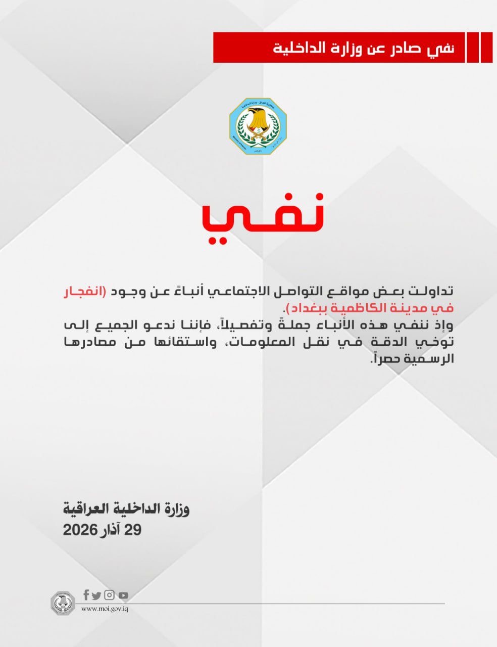 أمنالداخلية تنفي حدوث انفجار في مدينة الكاظمية ببغداد قبل ساعتين 9 مشاهدات شارك الداخلية تنفي حدوث انفجار في مدينة الكاظمية ببغداد الوسومالداخليةانفجارببغدادمدينة الكاظميةقد يهمك أيضا سياسة الاطار التنسيقي يدعو القوى السياسية لحسم ملف رئاسة الجمهورية واستثمار الموعد النهائي قبل 50 دقيقة 8 مشاهدات سياسة الإطار التنسيقي يؤكد رفضه للانتهاكات التي تتعرض لها السيادة العراقية قبل 56 دقيقة 6 مشاهدات سياسة بهاء الأعرجي: تحديد الثامن من نيسان المقبل موعداً نهائياً لحسم الاستحقاقات المعطلة قبل ساعتين 10 مشاهدات أمن هجوم بطائرة مسيرة يستهدف مقر الدعم الدبلوماسي الامريكي قرب مطار بغداد قبل ساعتين 7 مشاهدات أمن فصائل المقاومة تعلن تنفيذ 21 عملية ضد القواعد الامريكية في العراق والمنطقة قبل ساعتين 7 مشاهدات