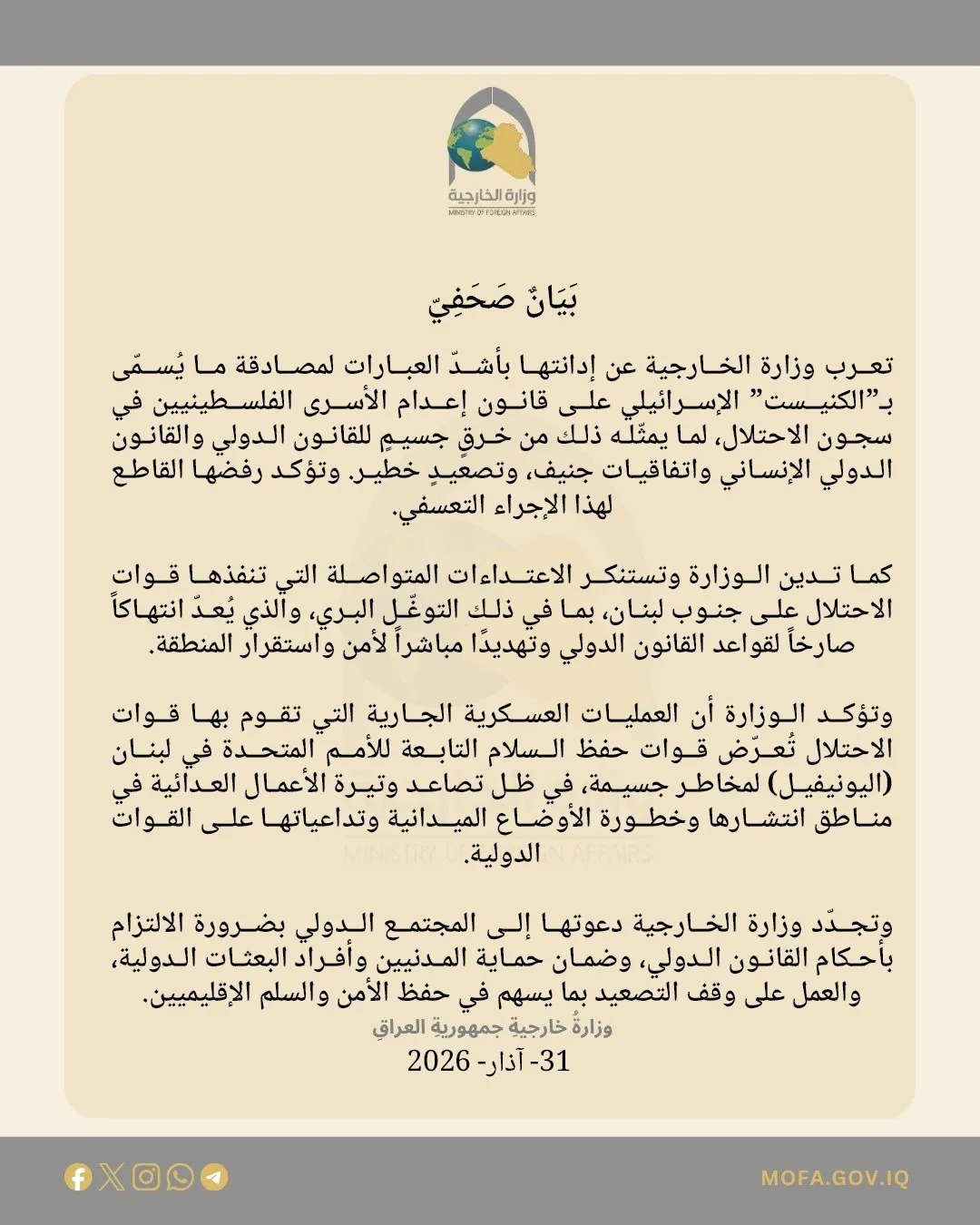 سياسةالعراق يدين مصادقة “الكنيست الإسرائيلي” على قانون إعدام الأسرى الفلسطينيين قبل ساعتين 5 مشاهدات شارك العراق يدين مصادقة "الكنيست الإسرائيلي" على قانون إعدام الأسرى الفلسطينيين الوسومإعدامالعراقالفلسطينيينقد يهمك أيضا أمن الأمن الوطني يعلن القبض على 73 تاجراً ومروّجاً للمخدرات خلال آذار قبل 7 دقائق 2 مشاهدات أمن إصابات بين صفوف منتسبي الحشد جراء قصف جوي على مرابطة في الرطبة غربي الأنبار قبل 8 دقائق 2 مشاهدات عربي ودولي ترامب: الولايات المتحدة لن تساعد الدول التي تعاني نقصاً في الوقود لأنها لم تساعدنا قبل 47 دقيقة 8 مشاهدات أمن سلطة الطيران المدني تعلن تمديد إغلاق الأجواء العراقية لمدة (72) ساعة قبل 52 دقيقة 8 مشاهدات أمن الحشد الشعبي: تعرض مقر اللواء 30 في نينوى إلى اعتداء غادر دون إصابات قبل 58 دقيقة 8 مشاهدات