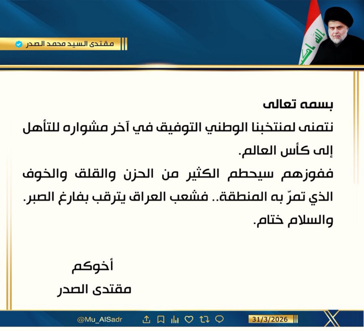 محلياتالسيد الصدر: نتمنى لمنتخبنا الوطني التوفيق في آخر مشواره للتأهل إلى كأس العالم قبل ساعتين 8 مشاهدات شارك السيد الصدر: نعزي العالم الإسلامي أجمع باستشهاد السيد الخامنئي الوسومالسيد الصدركأس العالممنتخبنا الوطنيقد يهمك أيضا سياسة الخارجية الأمريكية: نتابع عن كثب التقارير المتعلقة باختطاف صحفية في العراق قبل 15 دقيقة 4 مشاهدات عربي ودولي ترامب: المساعي الدبلوماسية مع إيران تسير على ما يرام قبل 29 دقيقة 9 مشاهدات أمن مسيرة ثانية تستهدف مقر الدعم الدبلوماسي الامريكي في مطار بغداد قبل 32 دقيقة 8 مشاهدات أمن شؤون المخدرات: اعتقال اكثر من 3500 متهم وضبط ما يزيد عن طن من المواد المخدرة في 2026 قبل 34 دقيقة 11 مشاهدات أمن الحشد الشعبي: تعرض اللواء 30 في نينوى إلى ضربات جوية دون خسائر بشرية قبل 46 دقيقة 9 مشاهدات