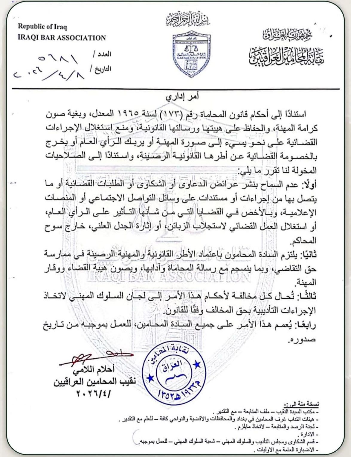 واضاف، ان “نقابة المحامين اصدرت أمرًا إداريًا جديدًا استنادًا إلى أحكام قانون المحاماة رقم (173) لسنة 1965 المعدل، يهدف إلى صون كرامة مهنة المحاماة والحفاظ على هيبتها ورسالتها القانونية، ومنع أي ممارسات منشأنها الإساءة إلى صورة المهنة أو التأثير على الرأي العام خارج الأطر القضائية”.