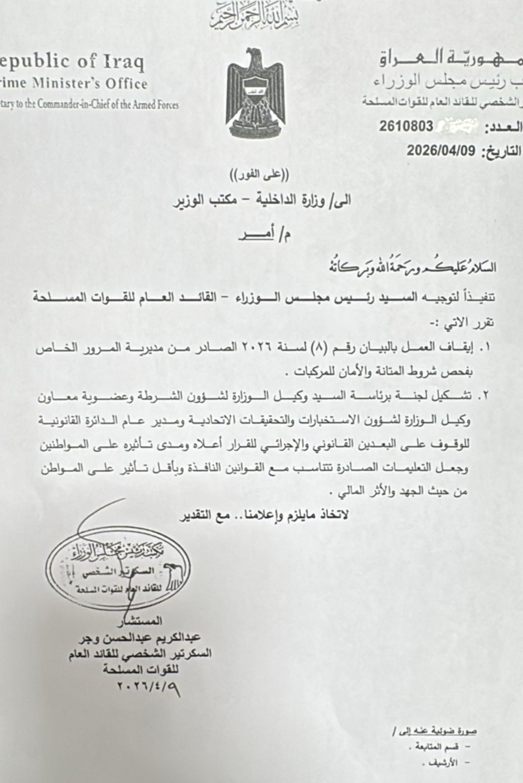 محلياتبالوثيقة.. رئاسة الوزراء تقرر إيقاف العمل بقرار المرور الخاص بفحص “الهزة” سنوياً قبل ساعتين 18 مشاهدات شارك بالوثيقة.. رئاسة الوزراء تقرر إيقاف العمل بقرار المرور الخاص بفحص "الهزة" سنوياً الوسومالعملالمروربالوثيقةرئاسة الوزراءقد يهمك أيضا سياسة مسؤول بالخارجية الأمريكية: موظفون في سفارتنا بالعراق تعرضوا الأربعاء لهجوم بمسيرات قرب مطار بغداد قبل 3 دقائق 2 مشاهدات أمن الحشد الشعبي: حصيلة العدوان على العراق بلغت نحو 80 شهيدًا وأكثر من 270 جريحًا قبل 26 دقيقة 10 مشاهدات عربي ودولي الصحة اللبنانية: 1953 شهيدا و6303 مصابين في العدوان الإسرائيلي على البلاد منذ 2 مارس الماضي قبل 27 دقيقة 7 مشاهدات عربي ودولي رئيس الوزراء الباكستاني: إيران والولايات المتحدة مستعدتان للتفاوض وحل الخلافات بالمحادثات قبل 28 دقيقة 8 مشاهدات رياضة أتلتيكو يسخر من بكاء برشلونة والريال بسبب التحكيم قبل 44 دقيقة 8 مشاهدات