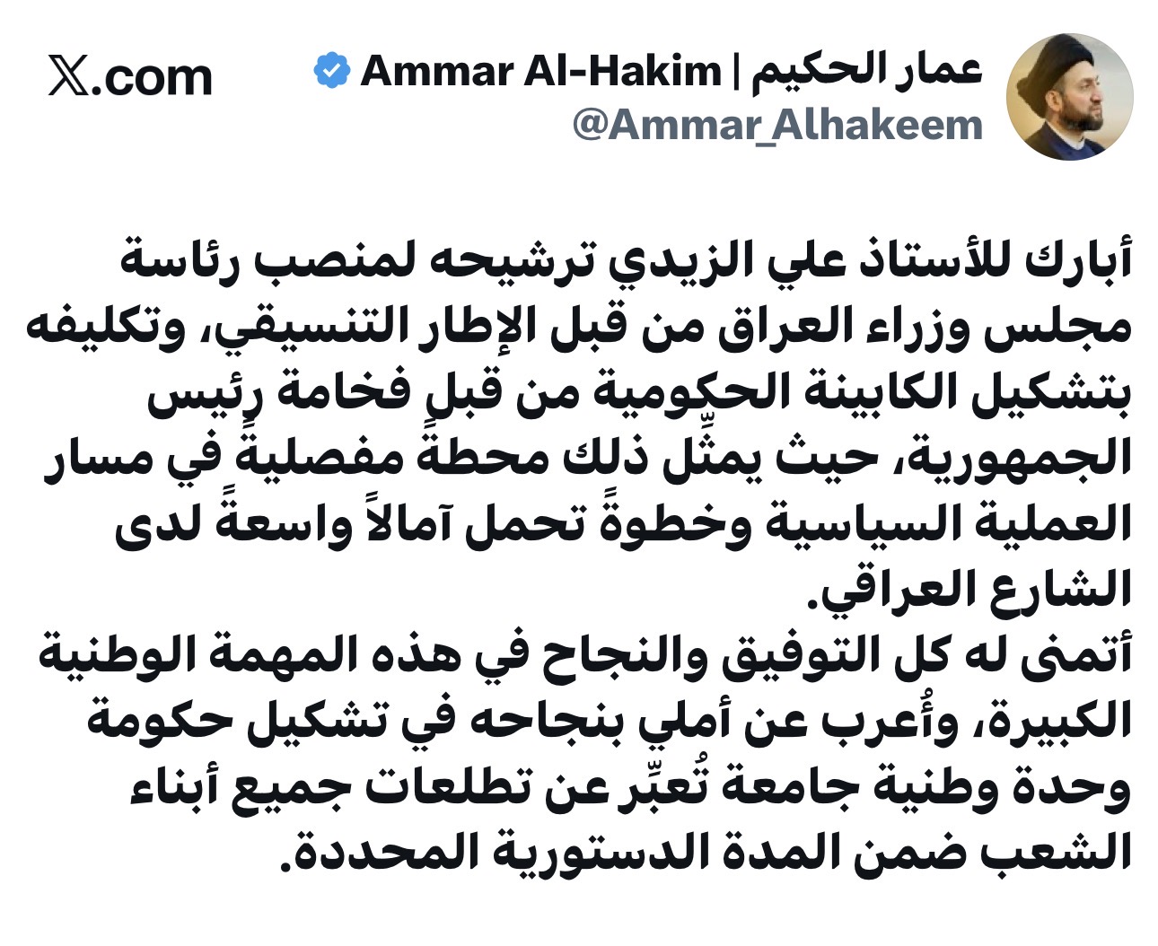 سياسةالحكيم يبارك لـ”علي الزيدي” ترشيحه لرئاسة الوزراء وتكليفه بتشكيل الكابينة الحكومية قبل ساعة واحدة 10 مشاهدات شارك الحكيم: الذهاب للأقاليم حاليا يخاطر بوحدة البلد رغم حقيقتها الدستورية الوسومالحكيمالكابينة الحكوميةرئاسة الوزراءعلي الزيديقد يهمك أيضا سياسة رئيس اقليم كردستان يبارك لـ”علي الزيدي” ترشيحه لرئاسة الوزراء وتكليفه بتشكيل الحكومة قبل 22 دقيقة 7 مشاهدات سياسة تحالف خدمات يبارك لـ”علي الزيدي” ترشيحه لرئاسة الوزراء وتكليفه بتشكيل الحكومة الجديدة قبل 56 دقيقة 14 مشاهدات سياسة رئيس الوزراء المكلف: عازمون على العمل مع جميع القوى لتشكيل حكومة تستجيب لمطالب المواطنين قبل ساعتين 12 مشاهدات سياسة السوداني: حريصون على التعاون مع الزيدي خلال مدة التكليف لإكمال متطلبات تشكيله للحكومة قبل ساعتين 10 مشاهدات سياسة السوداني يهنئ علي الزيدي لترشيحه لرئاسة الوزراء وتكليفه بتشكيل الحكومة الجديدة قبل ساعتين 6 مشاهدات
