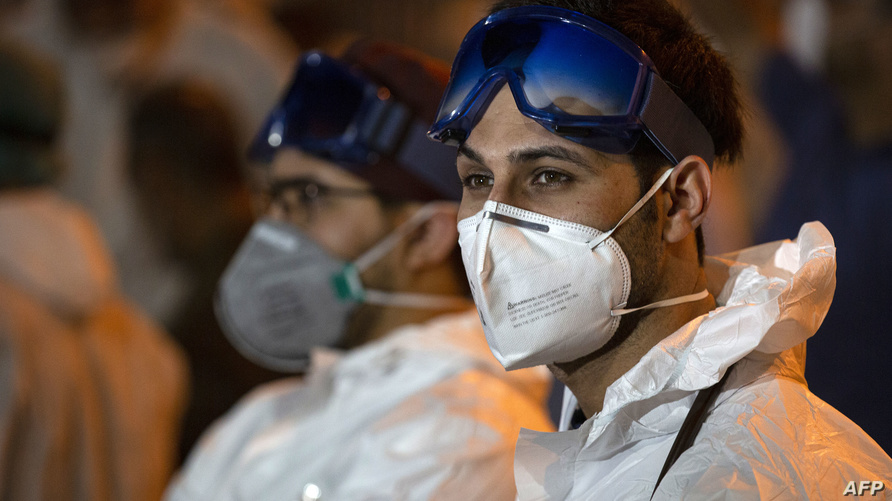Iraqi health personnel wearing full protective suits stand during a gartering to pay tribute to their efforts during the coronavirus COVID-19 pandemic crisis, in the southern city of Basra on April 07, 2020. - The health ministry says COVID-19 has killed 56 Iraqis and infected more than 800 others. But many suspect the real numbers to be much higher, as only a few thousand people from a population of 40 million have been tested. (Photo by Hussein FALEH / AFP)