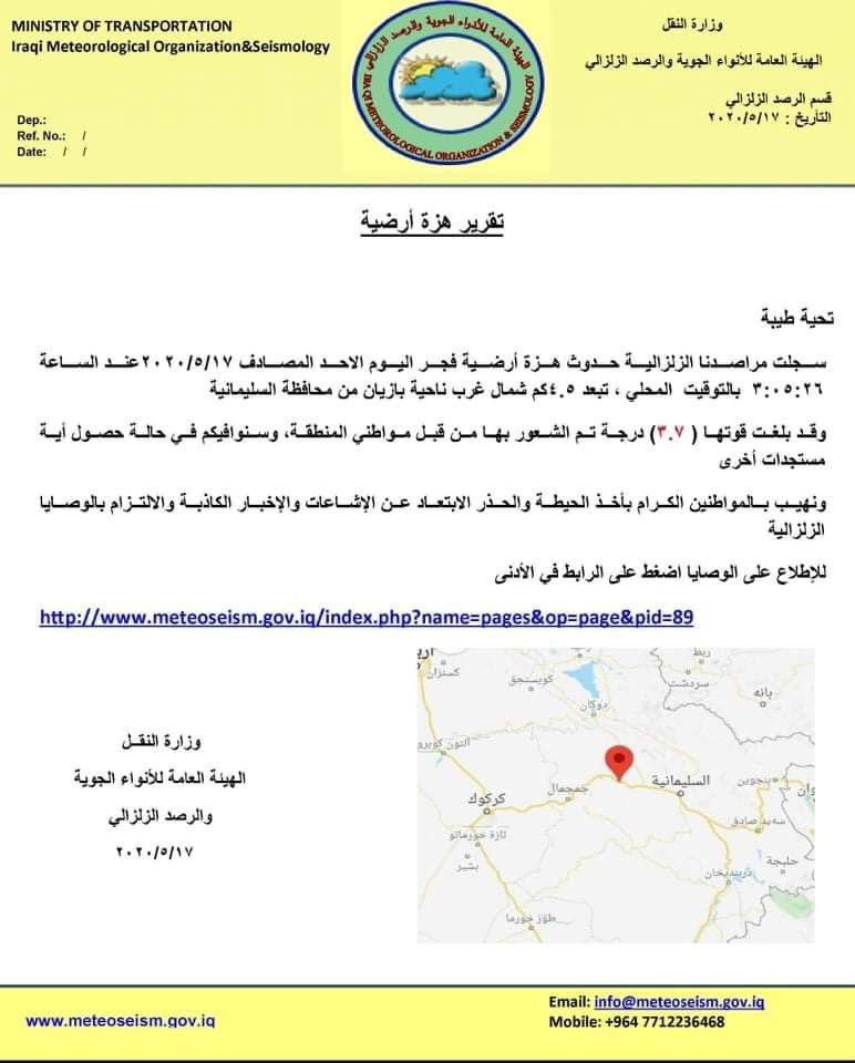 أعلنت وزارة النقل، اليوم الأحد، تسجيل حدوث هزة أرضية بقوة 3.7 على مقياس ريختر فجر اليوم في محافظة السليمانية.