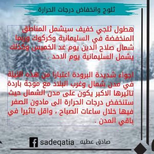 كشف المتنبئ الجوي صادق عطية، عن انخفاض درجات الحرارة دون الصفر في عدة مدن عراقية اعتبارا من الليلة.