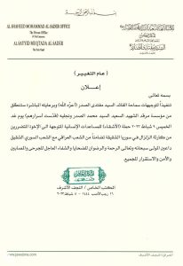 السيد الصدر يوجه بإطلاق حملة (الأشـقـاء) للمساعدات الإنسانية إلـى سوريا