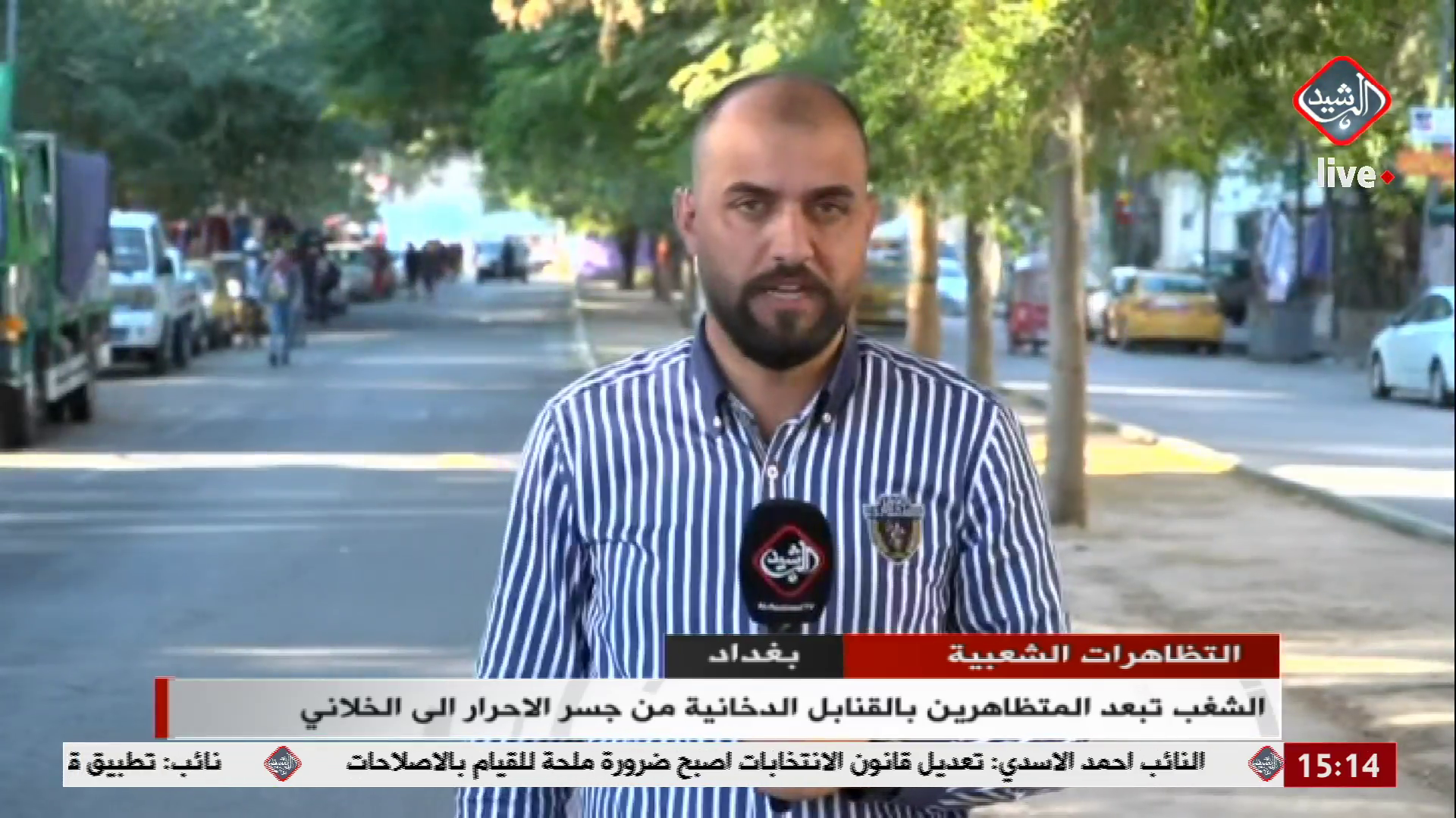 الشغب تبعد المتظاهرين بالقنابل الدخانية من جسر الاحرار الى الخلاني .. مراسل الرشيد من بغداد
