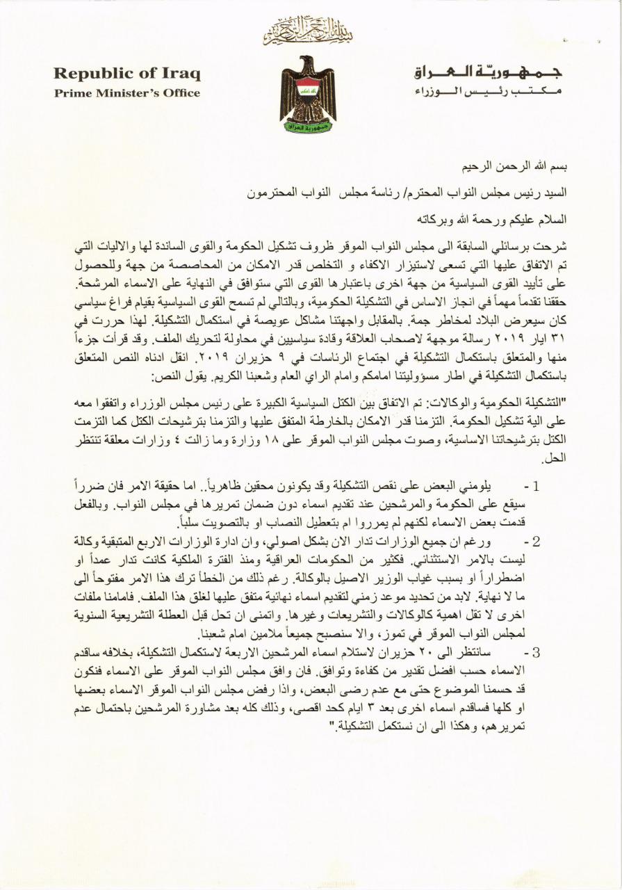 نص الرسالة التي وجهها عبدالمهدي الى الحلبوسي حول إستكمال التشكيلة الحكومية