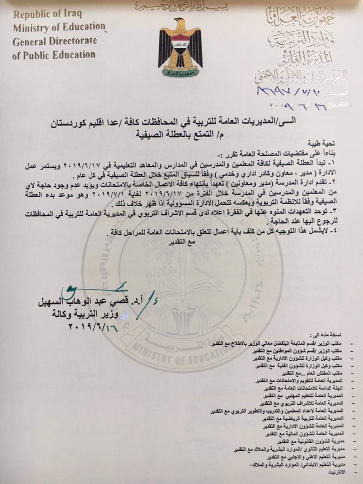 التربية تحدد السابع عشر من حزيران الجاري موعداً لبدء العطلة الصيفية للمعلمين