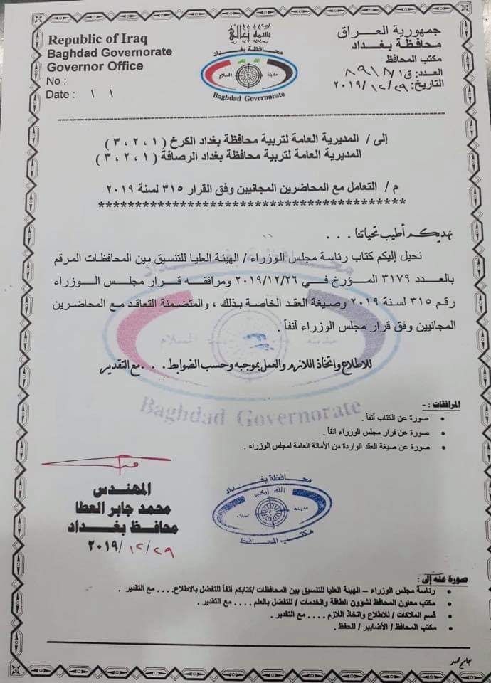 بالوثيقة .. محافظ بغداد يوجه مديريات التربية بالتعاقد مع المحاضرين بالمجان
