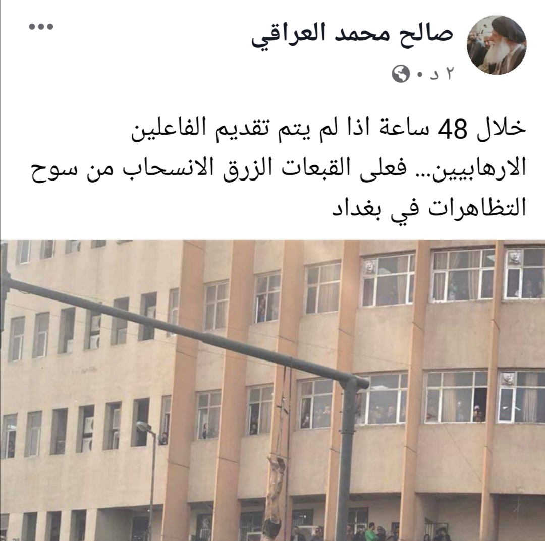 مقرب من الصدر حول حادثة الوثبة: اذا لم يقدم الارهابيين خلال 48 ساعة فعلى القبعات الزرق الانسحاب من سوح التظاهر في بغداد