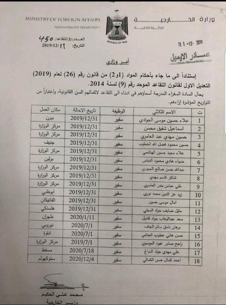 بالوثيقة .. وزارة الخارجية تحيل 29 سفيراً ووزيراً مفوضاً الى التقاعد