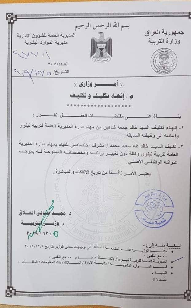 بالوثيقة .. انهاء تكليف مدير عام تربية نينوى