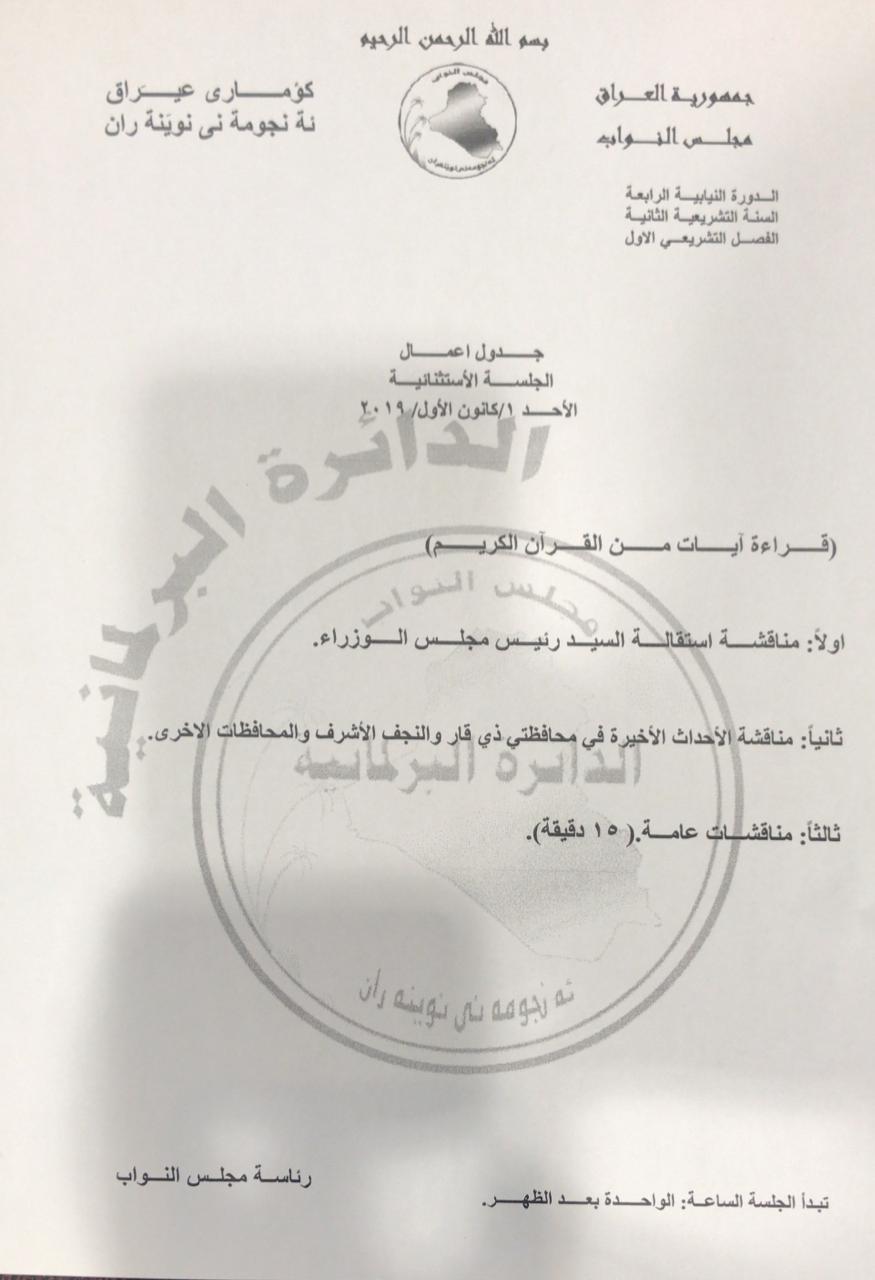 رئاسة البرلمان: سيتم مخاطبة رئيس الجمهورية لتسمية رئيس وزراء جديد حسب المادة ٧٦ من الدستور