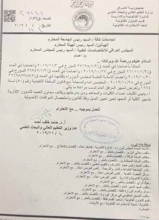 بالوثيقة.. إنهاء تكليف جميع عمداء الكليات والمعاهد في عموم العراق