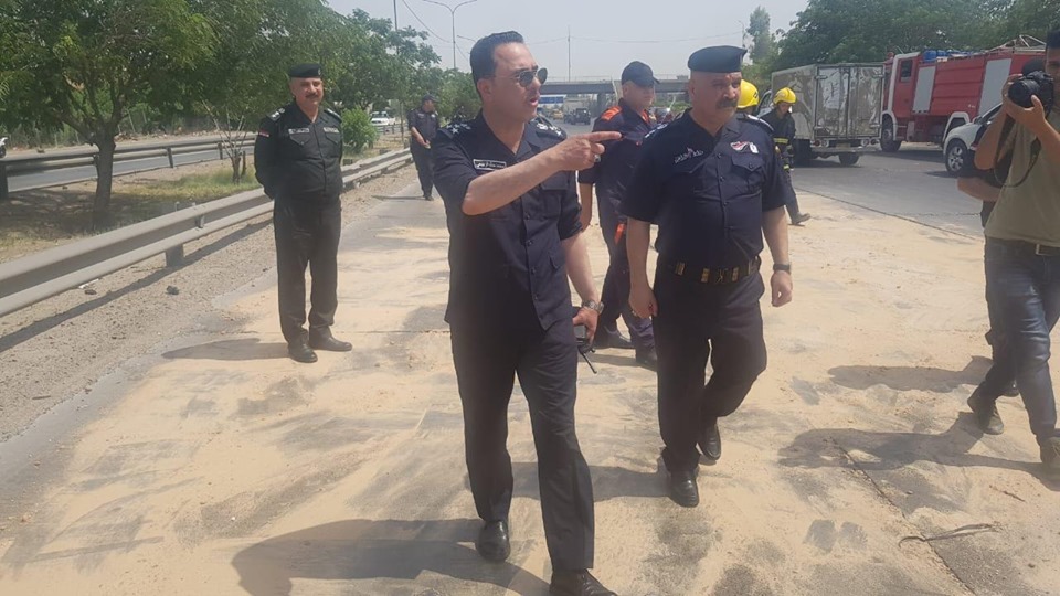 بالصور .. نجدة بغداد تنظف سريع الشعلة من مادة الكاز بعد حادث اصطدام 11 عجلة بسببه