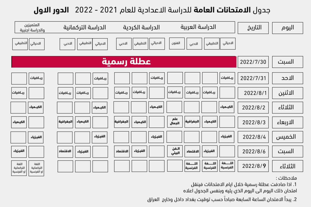 التربية تنشر جدول امتحانات السادس الاعدادي بعد التأجيل