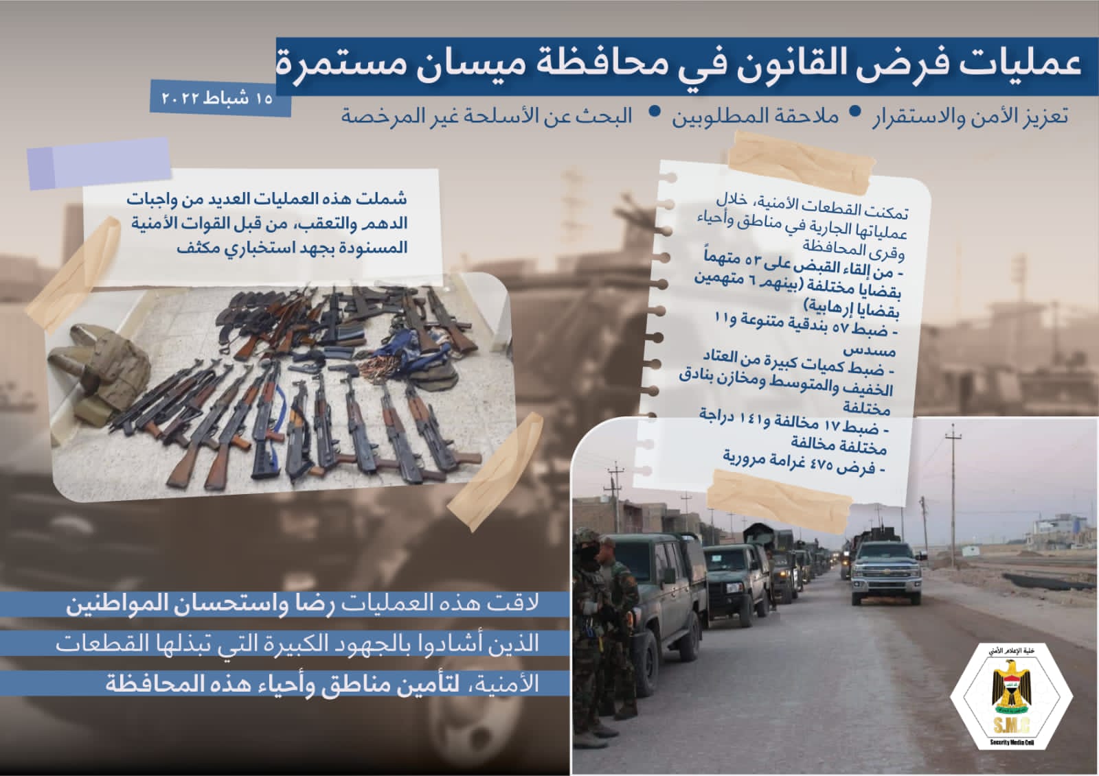الاعلام الامني: القبض على 53 متهماً بينهم ستة بقضايا إرهابية في ميسان