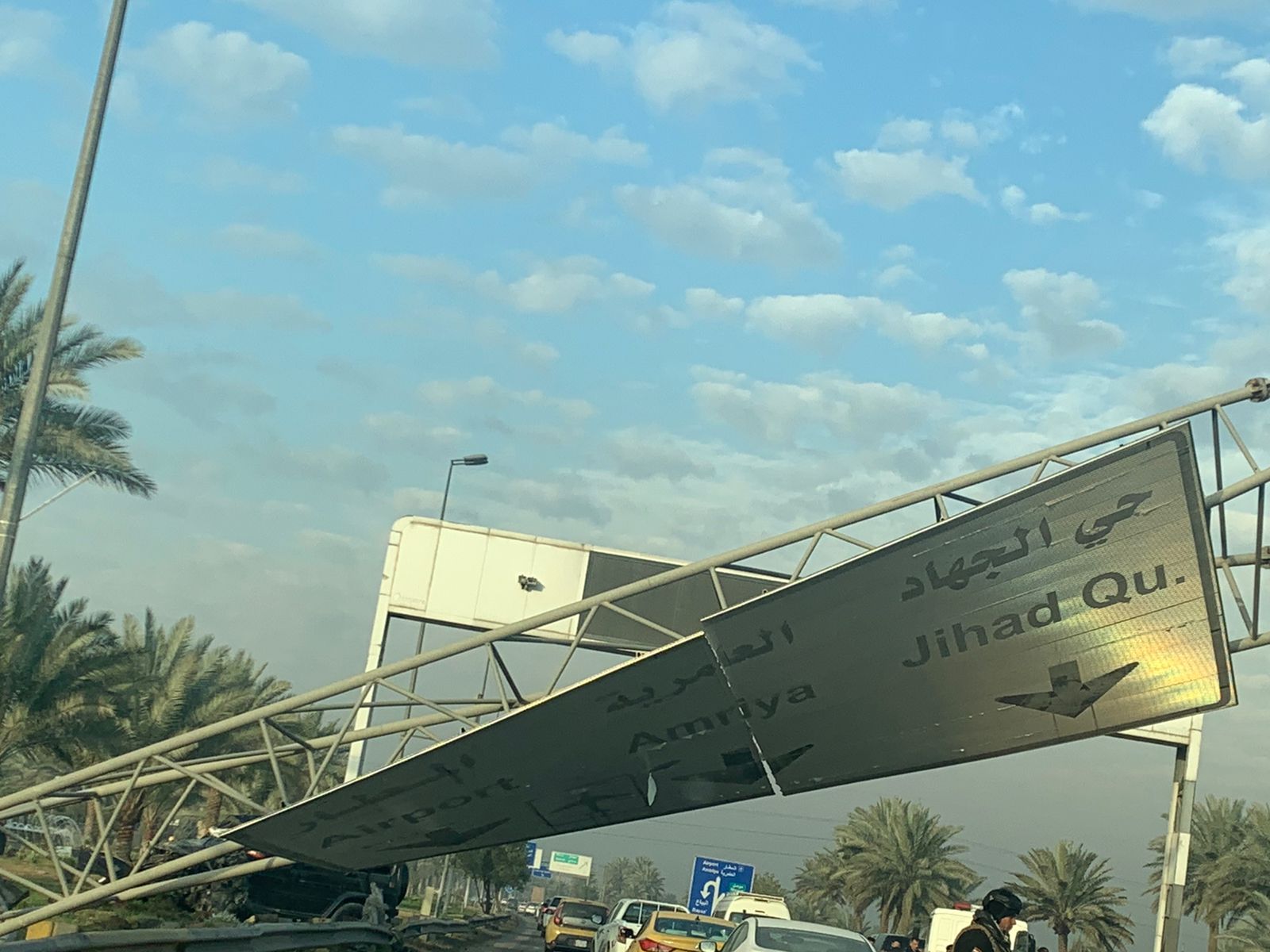 بالصور.. سائق يصطدم بالاشارة المرورية ويتسبب بازدحام شديد في شارع المطار