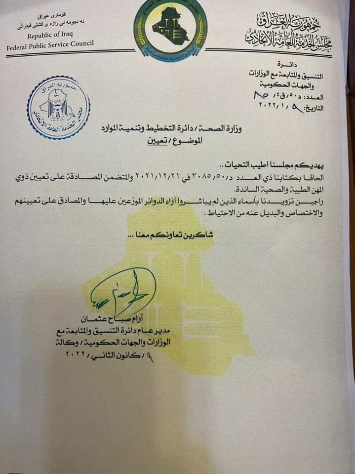 بالوثيقة.. مجلس الخدمة يطالب الصحة بتزويده باسماء المعينين الذين لم يباشروا