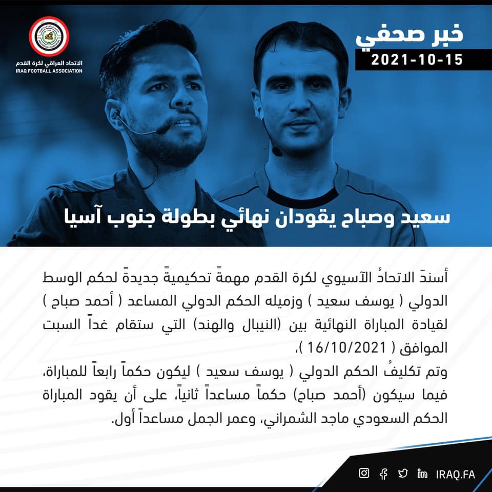 حكمان عراقيان يقودان نهائي بطولة جنوب آسيا