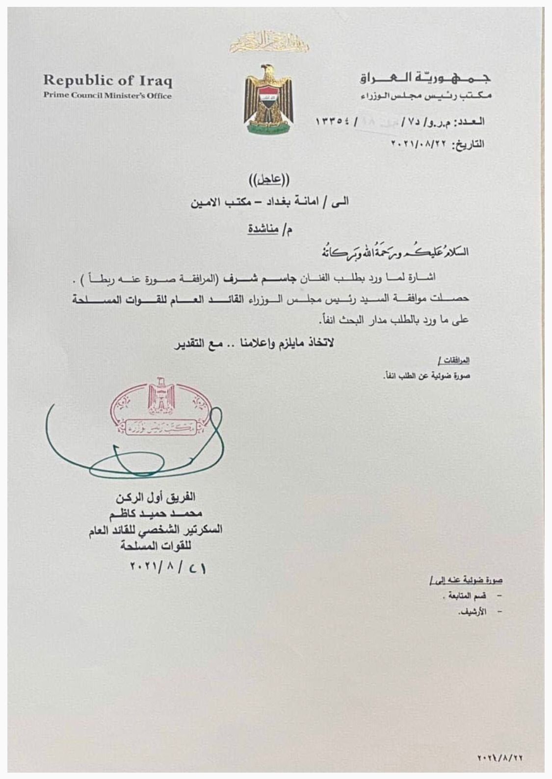بالوثيقة .. الكاظمي يستجيب لطلب الفنان جاسم شرف ويوجه بتلبية جميع متطلباته