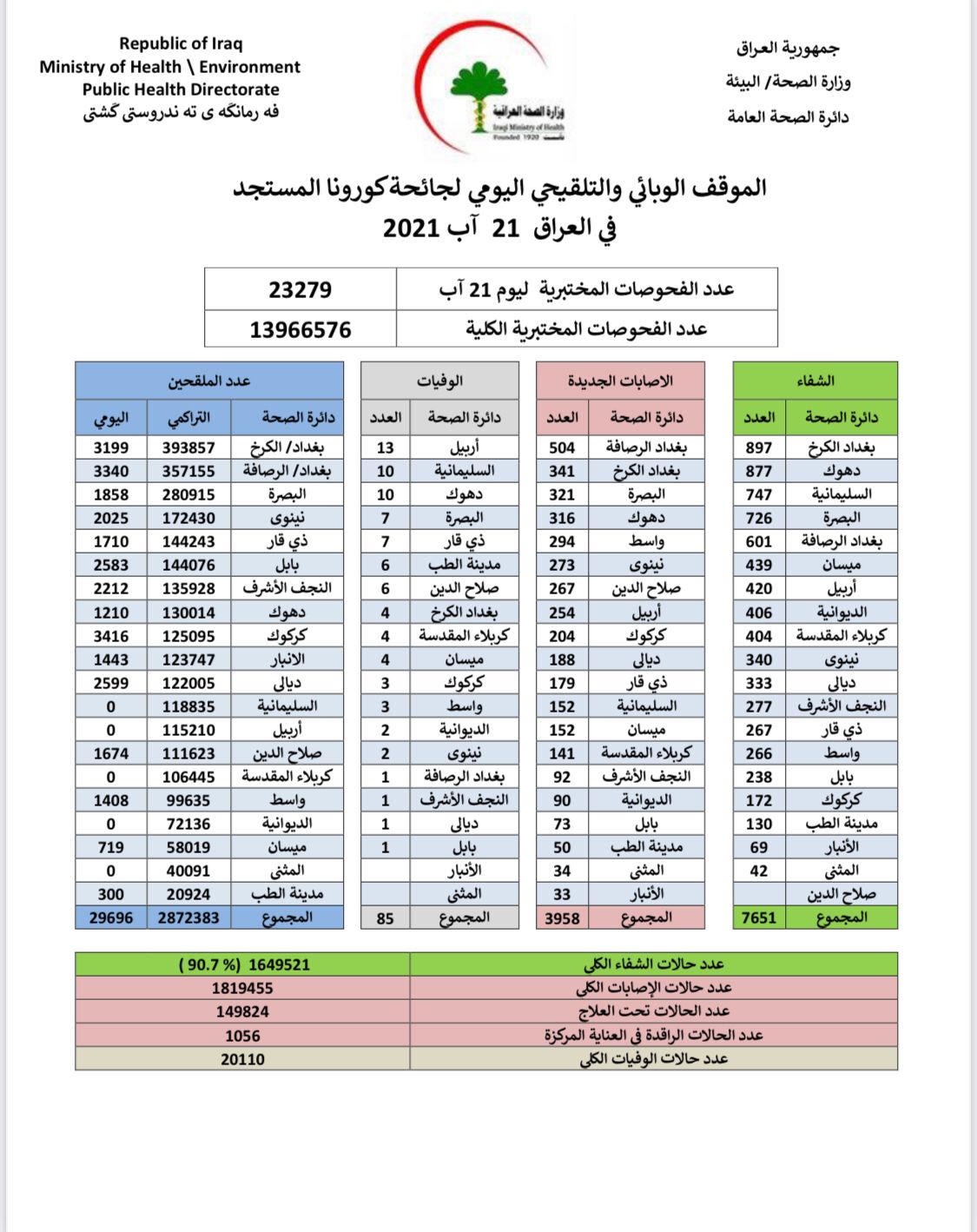 الصحة تعلن تسجيل 3958 اصابة جديدة بكورونا في عموم العراق