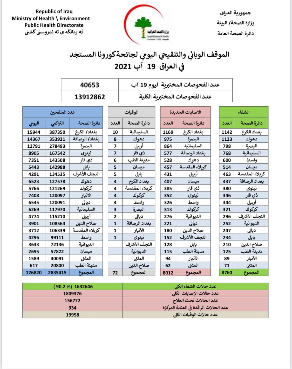 الصحة تعلن تسجيل 8012 اصابة جديدة بكورونا في عموم العراق