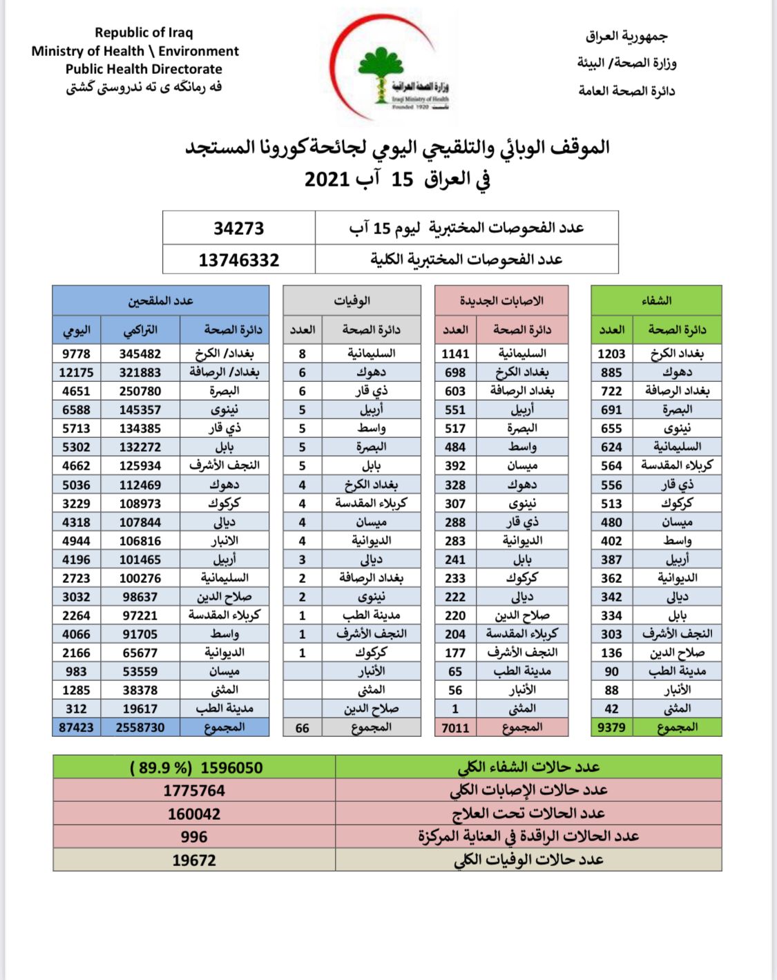 الصحة تعلن تسجيل 7011 اصابة جديدة بكورونا في عموم العراق