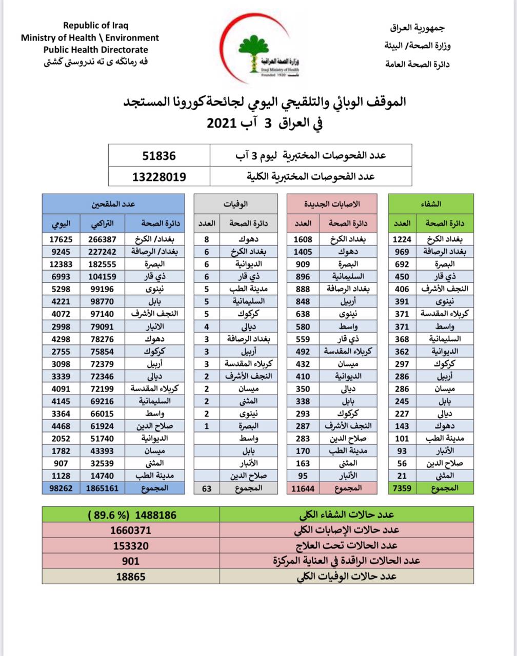 الصحة تعلن تسجيل 11644 اصابة جديدة بكورونا في عموم العراق