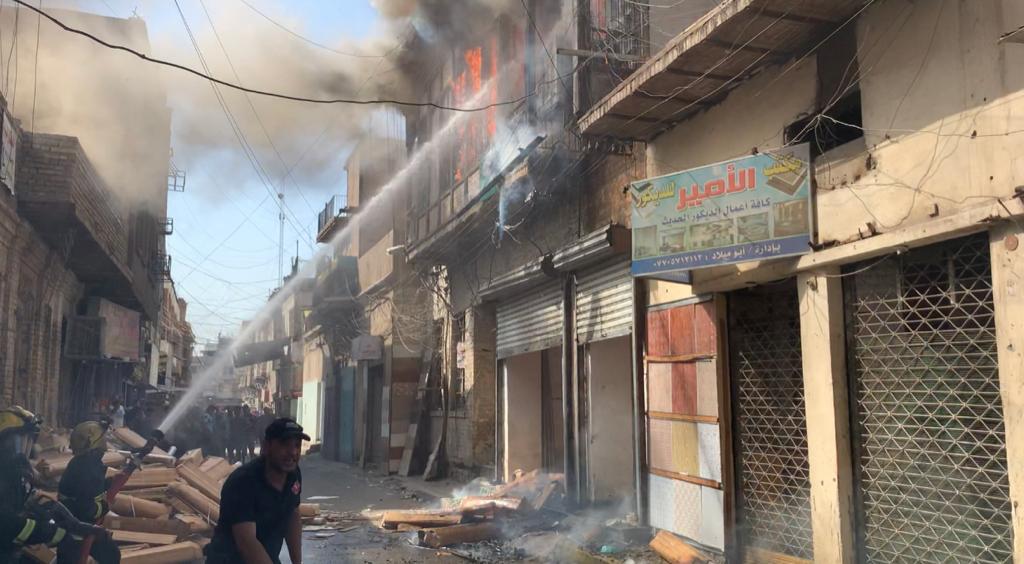الدفاع المدني ترسل 10 فرق لتخمد حادث حريق داخل بناية تراثية قديمة وسط بغداد