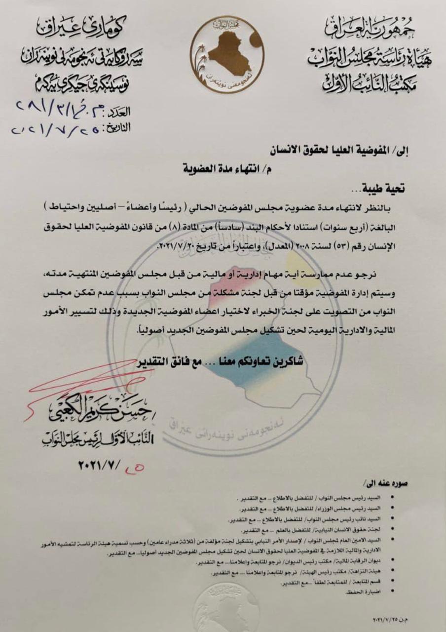 بالوثيقة .. رئاسة البرلمان توجه بانهاء مهام مفوضية حقوق الانسان وتشكل لجنة مؤقتة