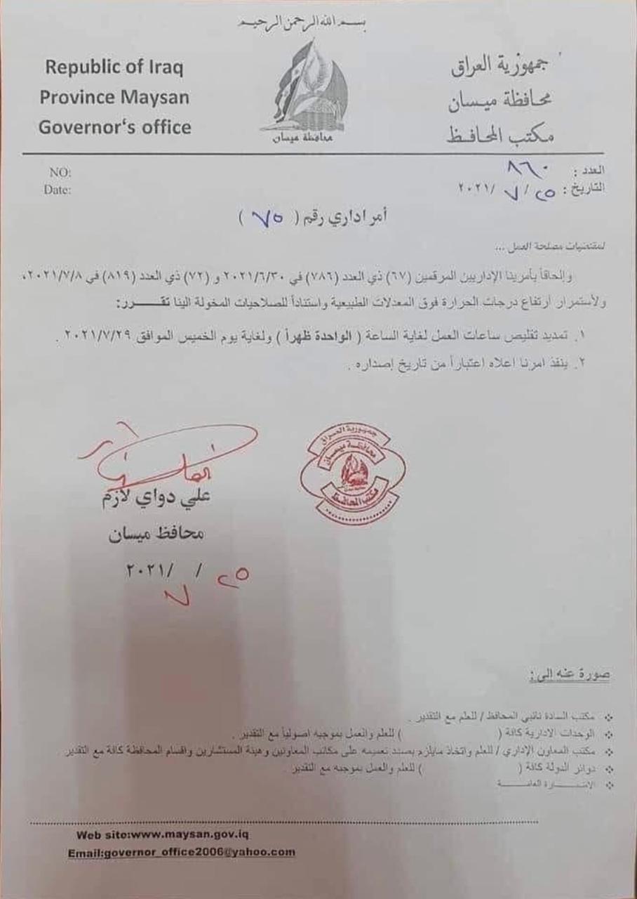 ميسان تقرر تمديد تقليص ساعات الدوام الرسمي