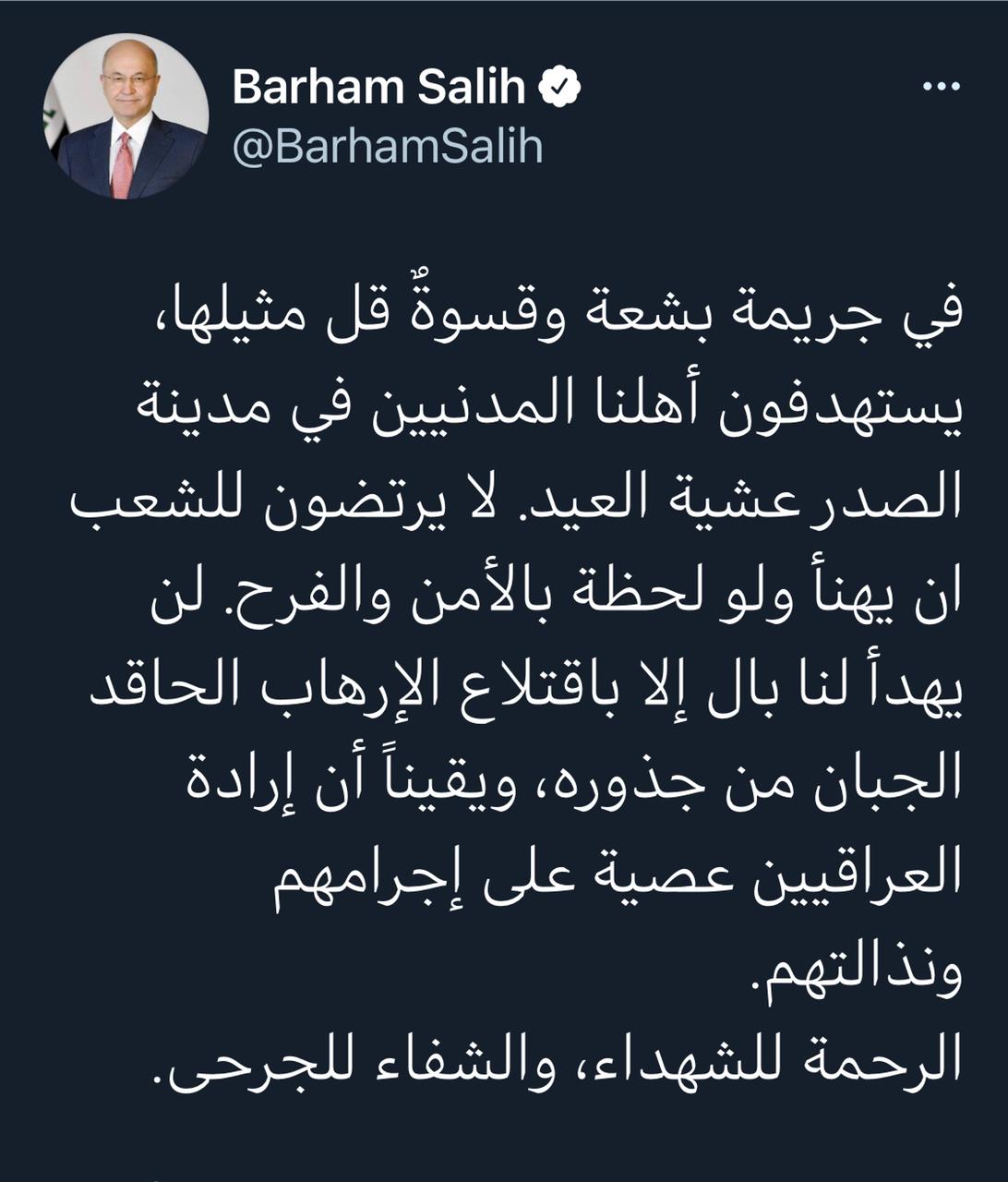 رئيس الجمهورية: تفجير مدينة الصدر جريمة بشعة وقسوةٌ قل مثيلها عشية العيد