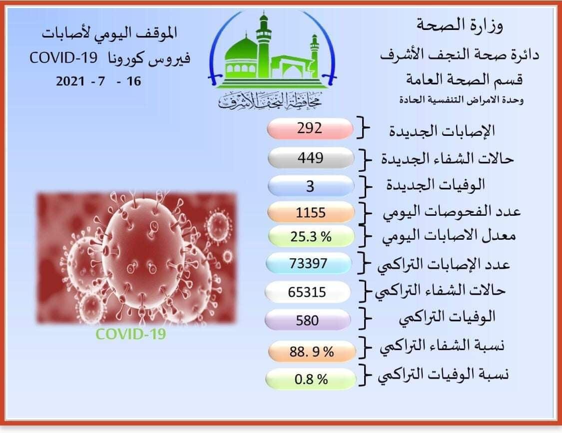 صحة النجف تسجيل 292 اصابة جديدة و 3 وفيات بكورونا في المحافظة