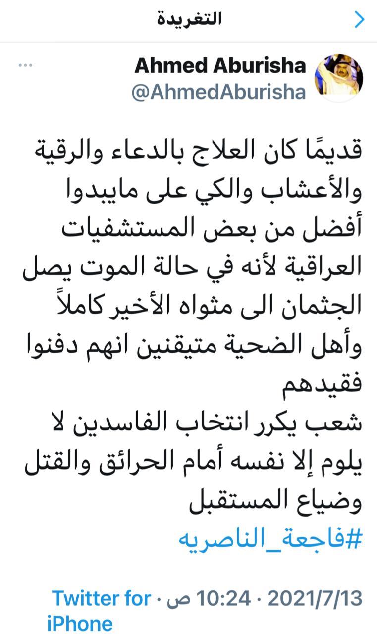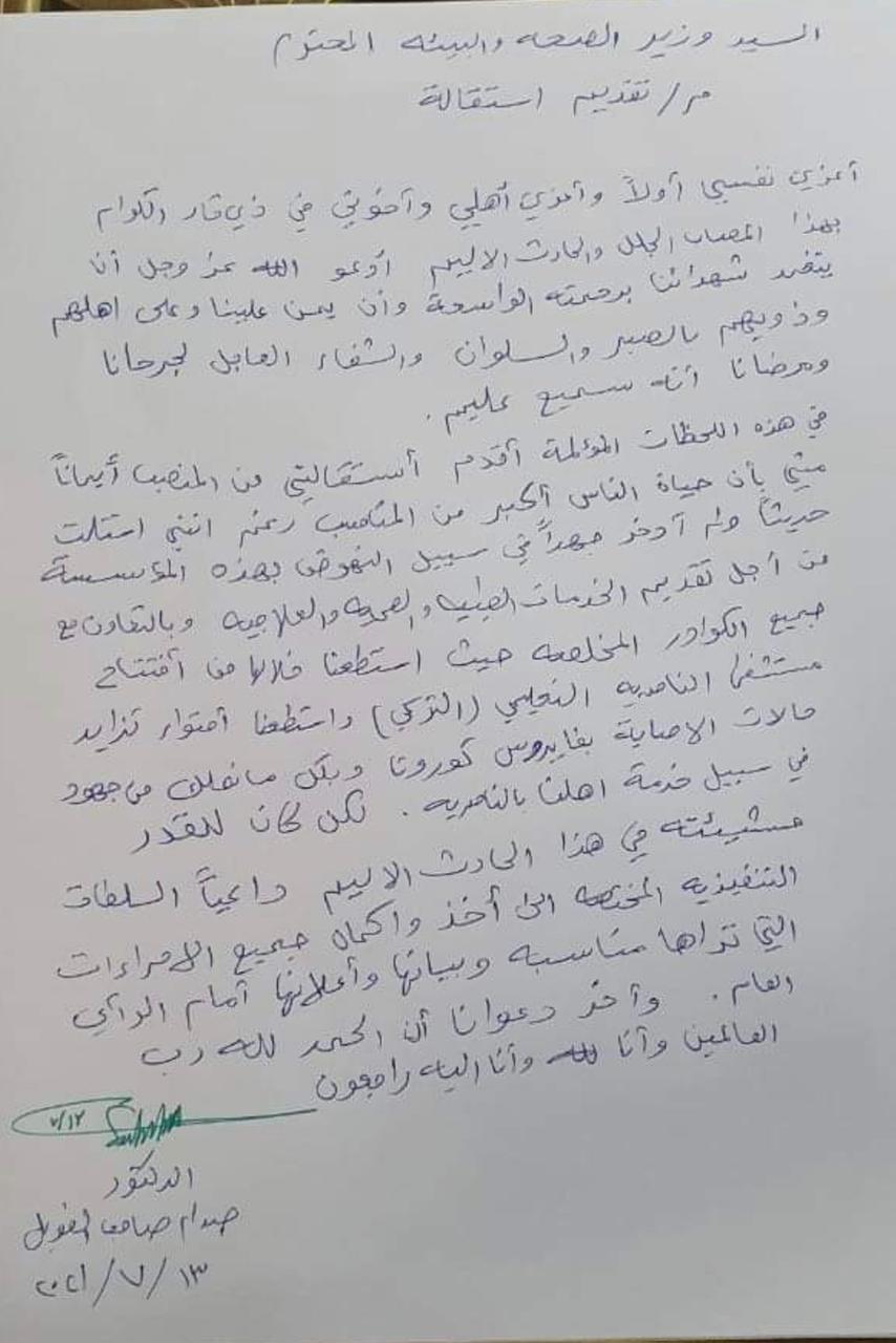 بالوثيقة .. استقالة مدير صحة ذي قار على خلفية حريق مستشفى الحسين