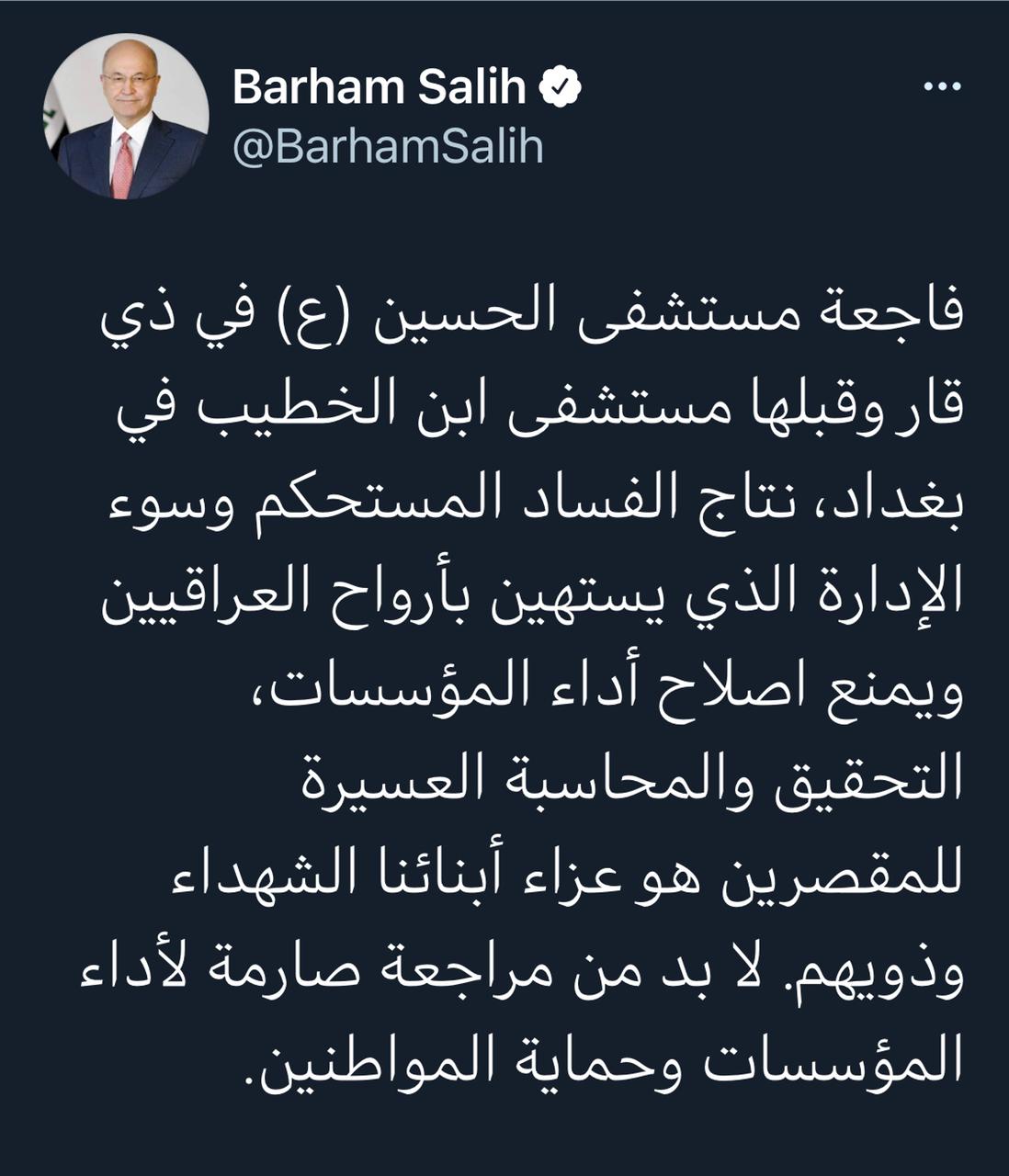 رئيس الجمهورية: فاجعة مستشفى الحسين في ذي قار نتاج الفساد المستحكم وسوء الإدارة