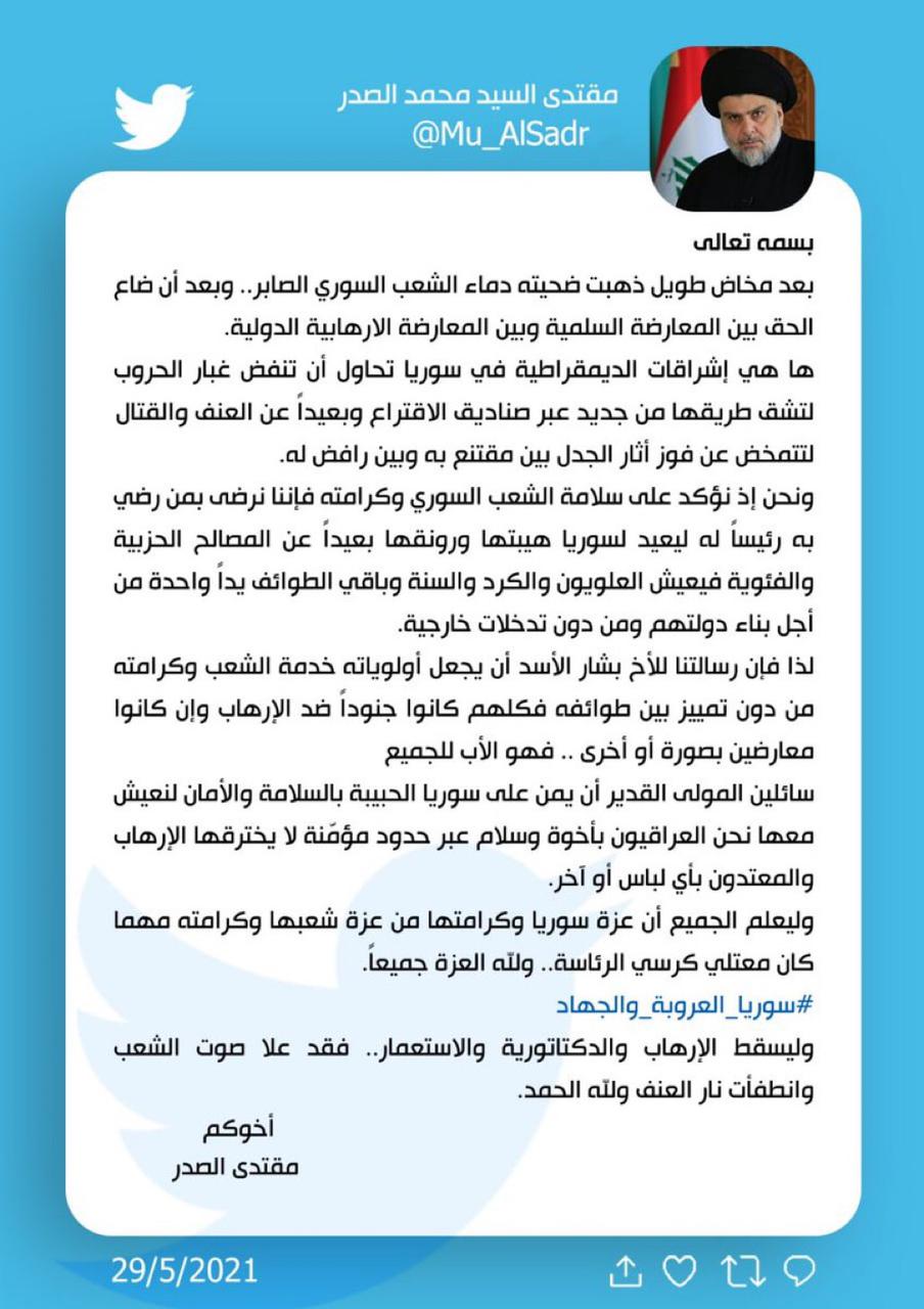 الصدر: رسالتنا للاخ بشار الاسد ان يجعل اولوياته خدمة الشعب وكرامته من دون تمييز بين طوائفه