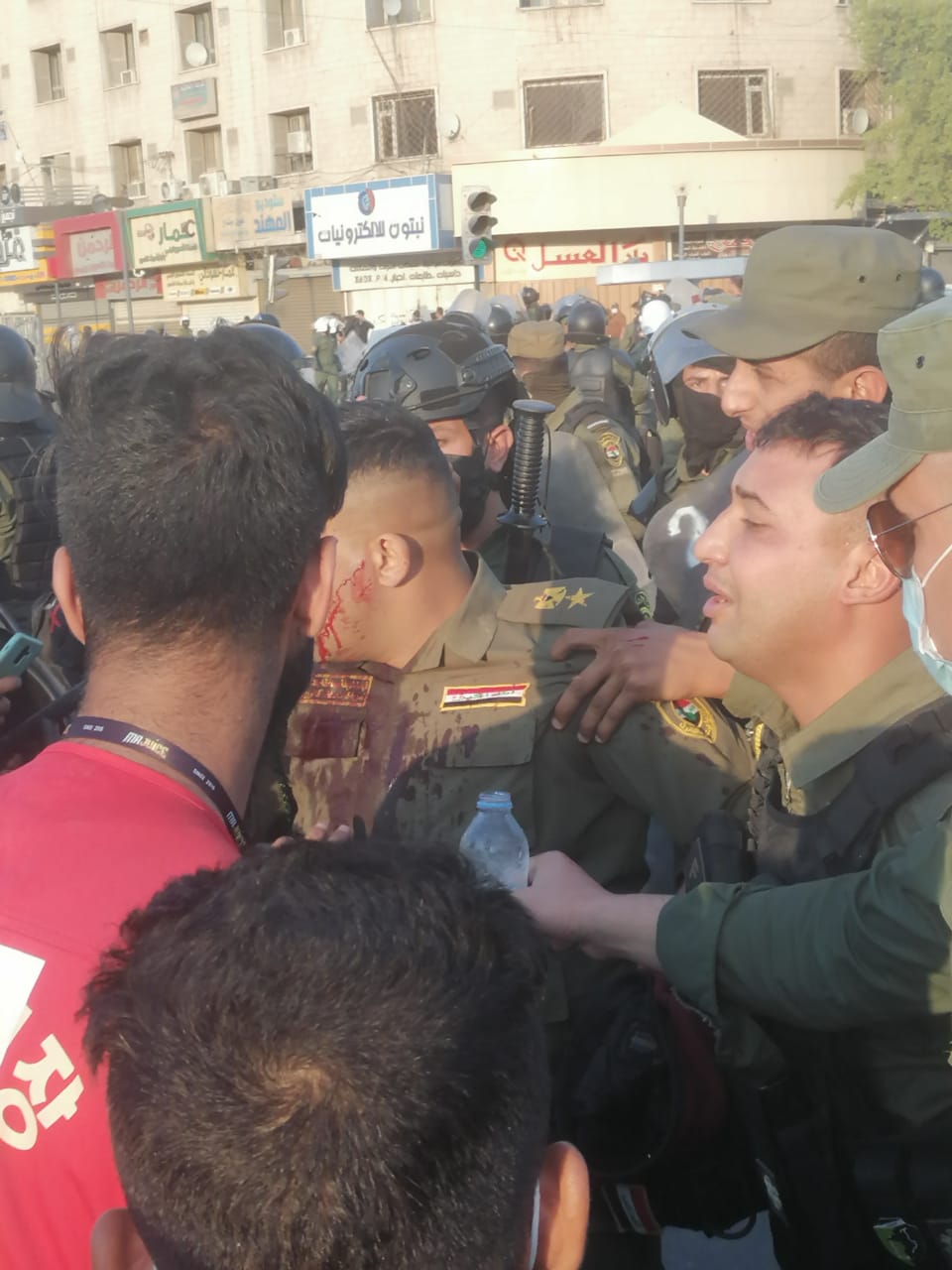 بالصور والفيديو .. اصابة امر احدى وحدات حفظ القانون باشتباكات التحرير وسط بغداد
