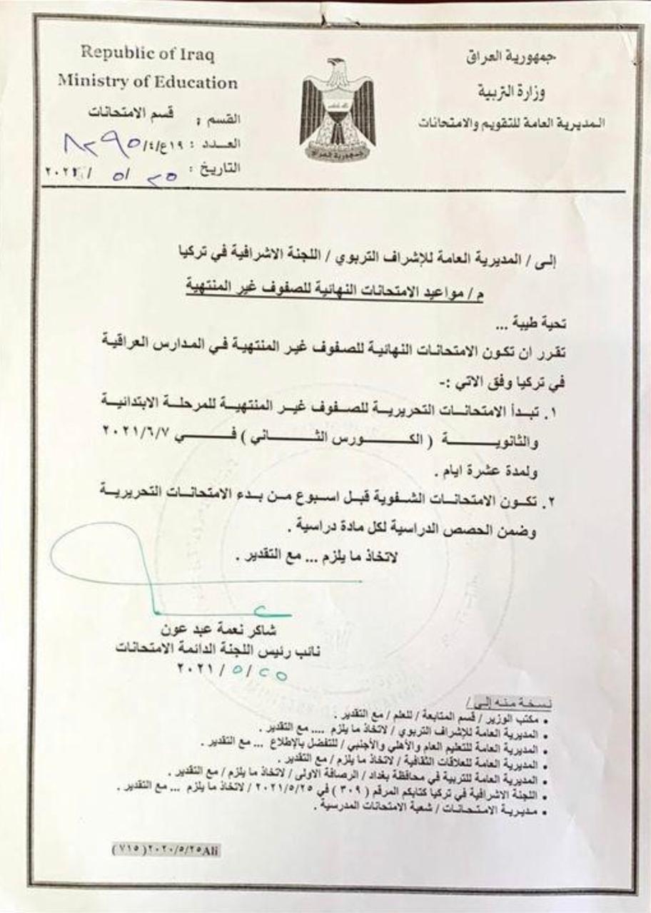 التربية تحدد موعد الامتحانات النهائية للصفوف غير المنتهية للمدارس العراقية في تركيا
