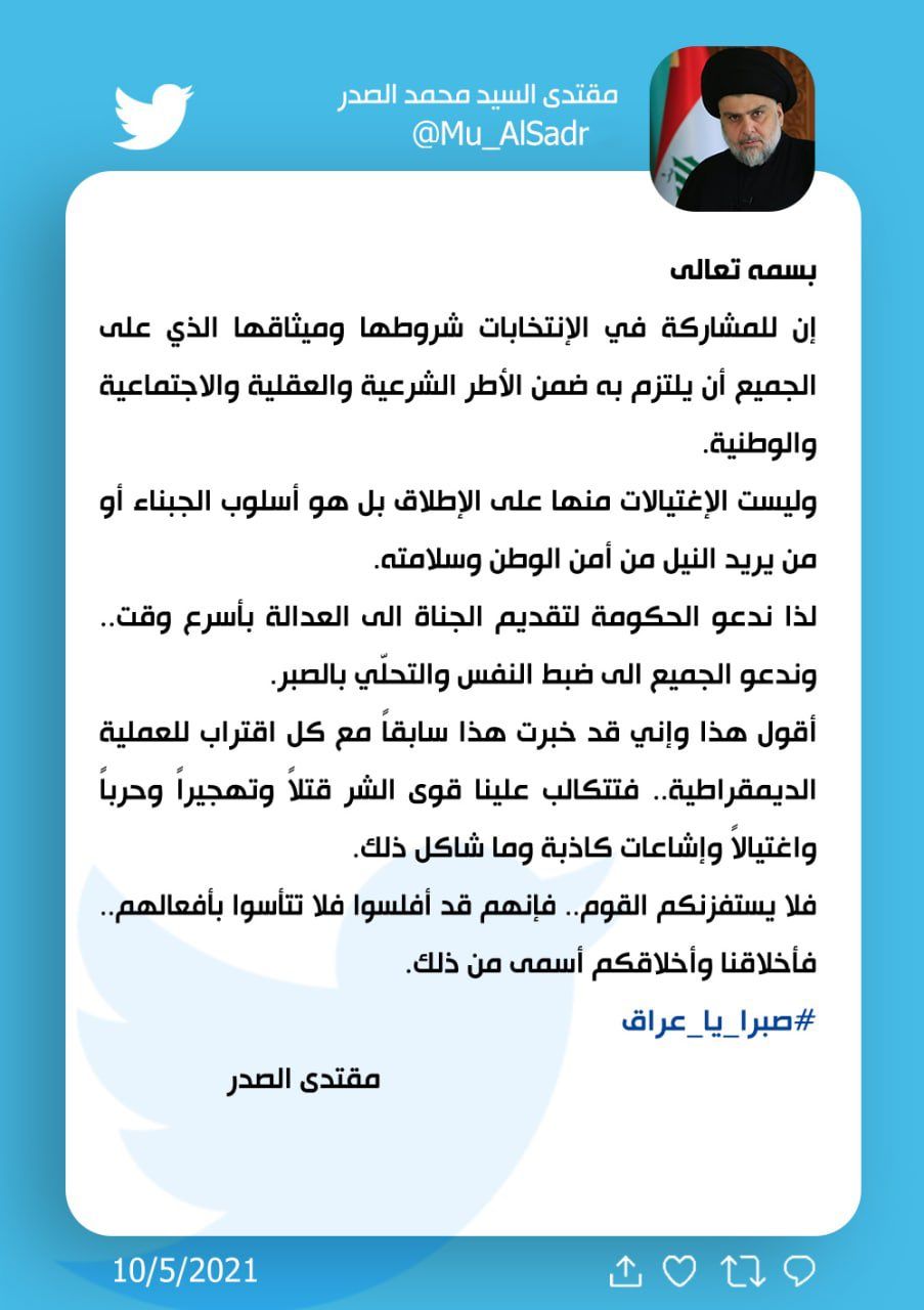 الصدر: المشاركة في الانتخابات لها شروطها وميثاقها وليست الاغتيالات منها على الاطلاق