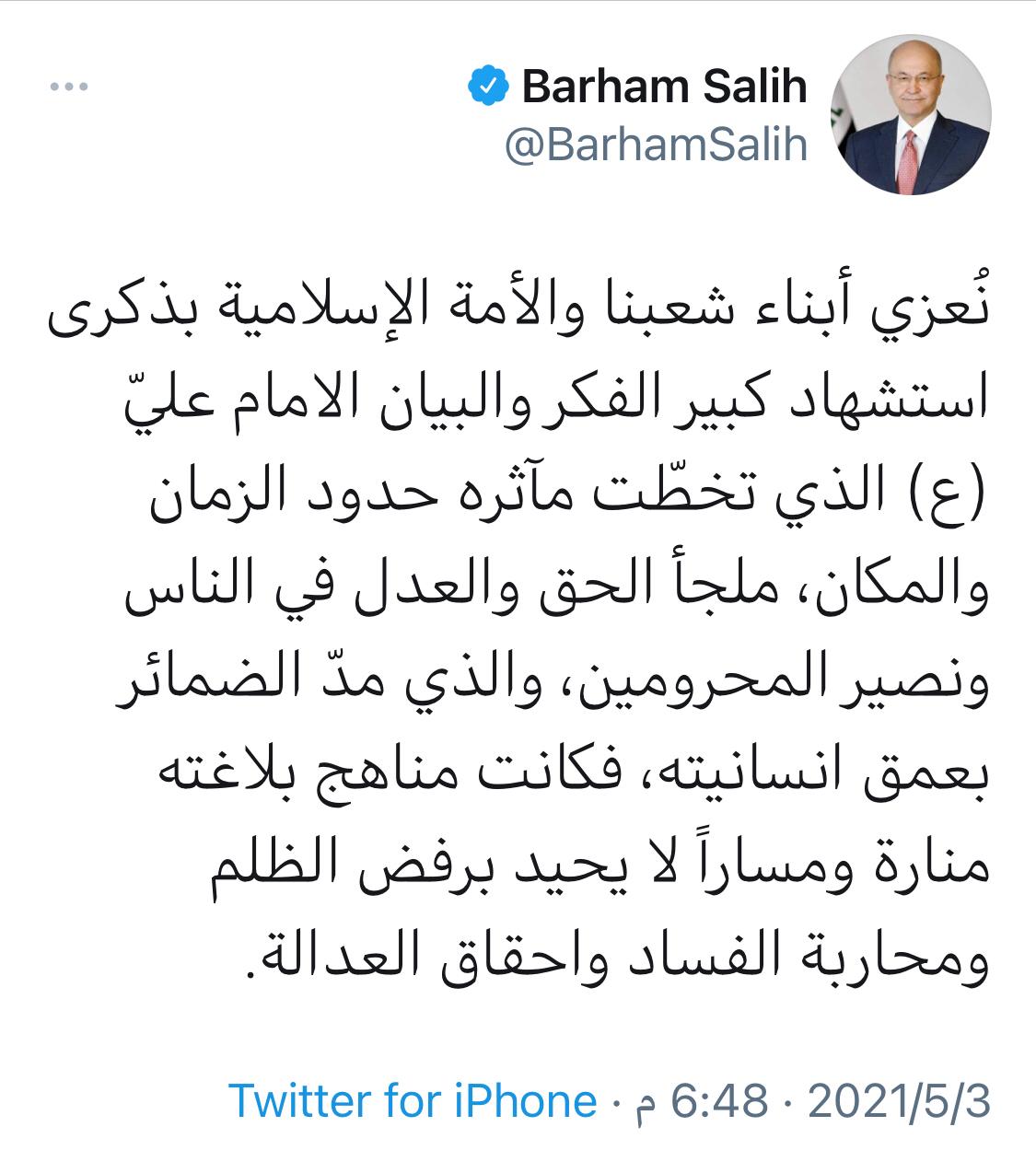 رئيس الجمهورية يعزي بذكرى استشهاد الامام علي عليه السلام
