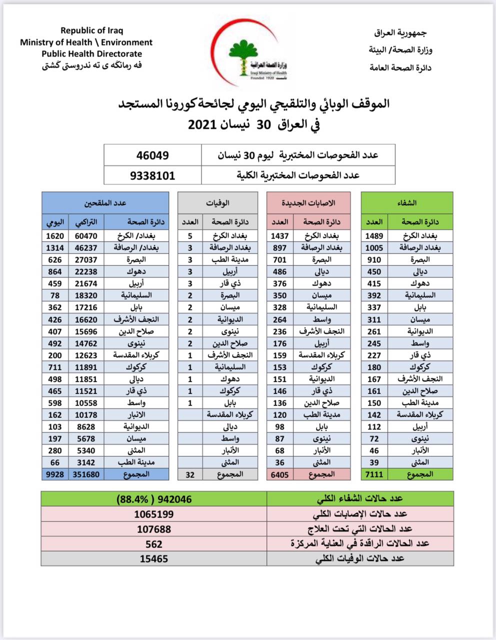 الصحة تعلن تسجيل 6405 اصابة جديدة بكورونا في عموم العراق