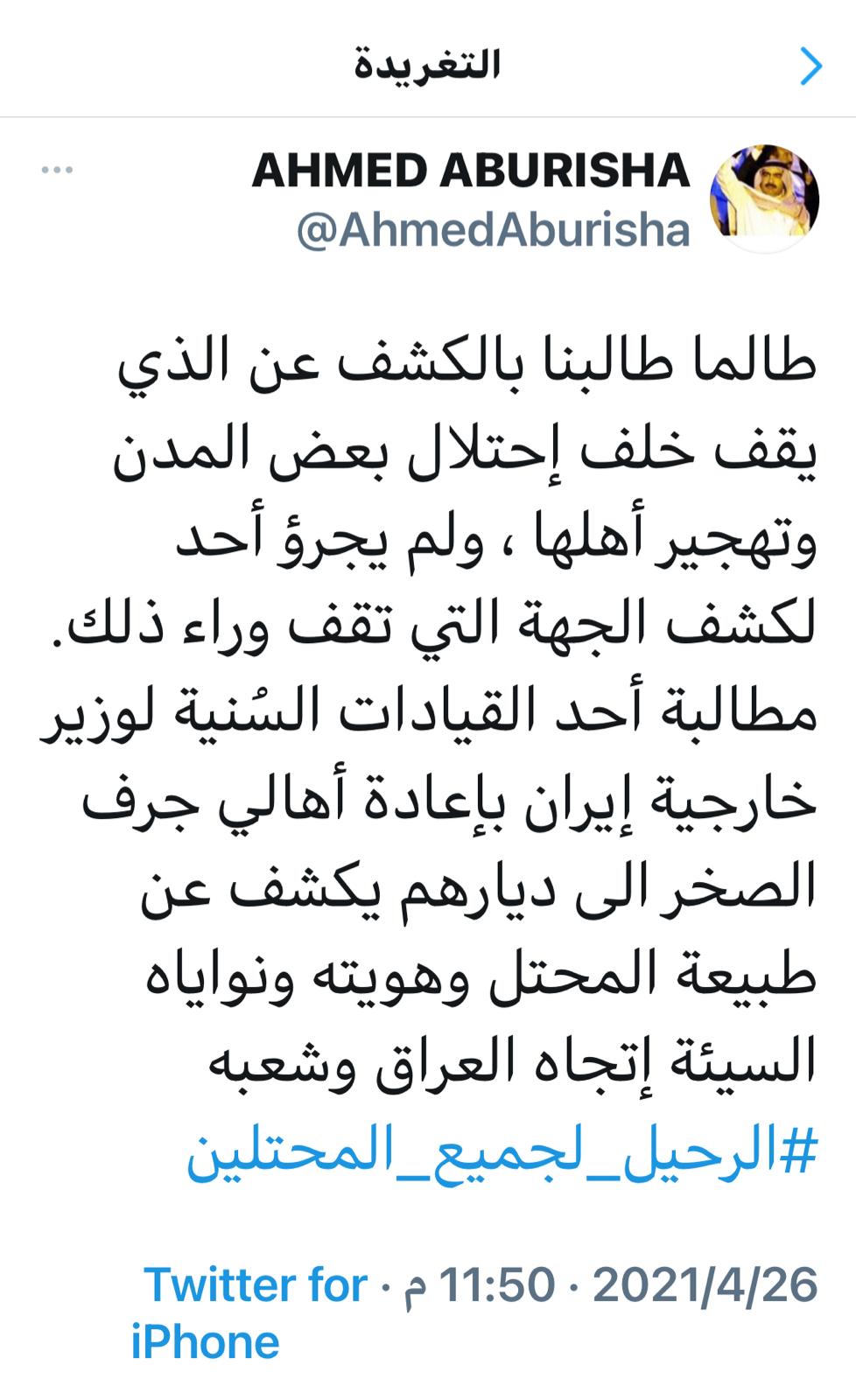 الشيخ ابو ريشة: مطالبة احد القيادات السنية لوزير الخارجية الايراني اعادة اهالي جرف الصخر يكشف طبيعة المحتل ونواياه السيئة