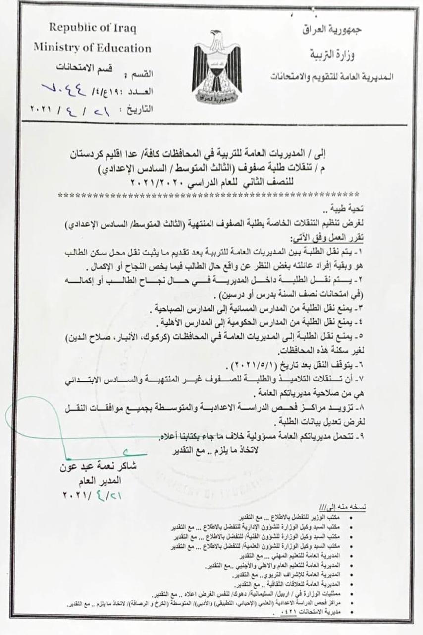 التربية تحدد ضوابط تنقل طلبة الصفوف المنتهية خلال النصف الدراسي الثاني