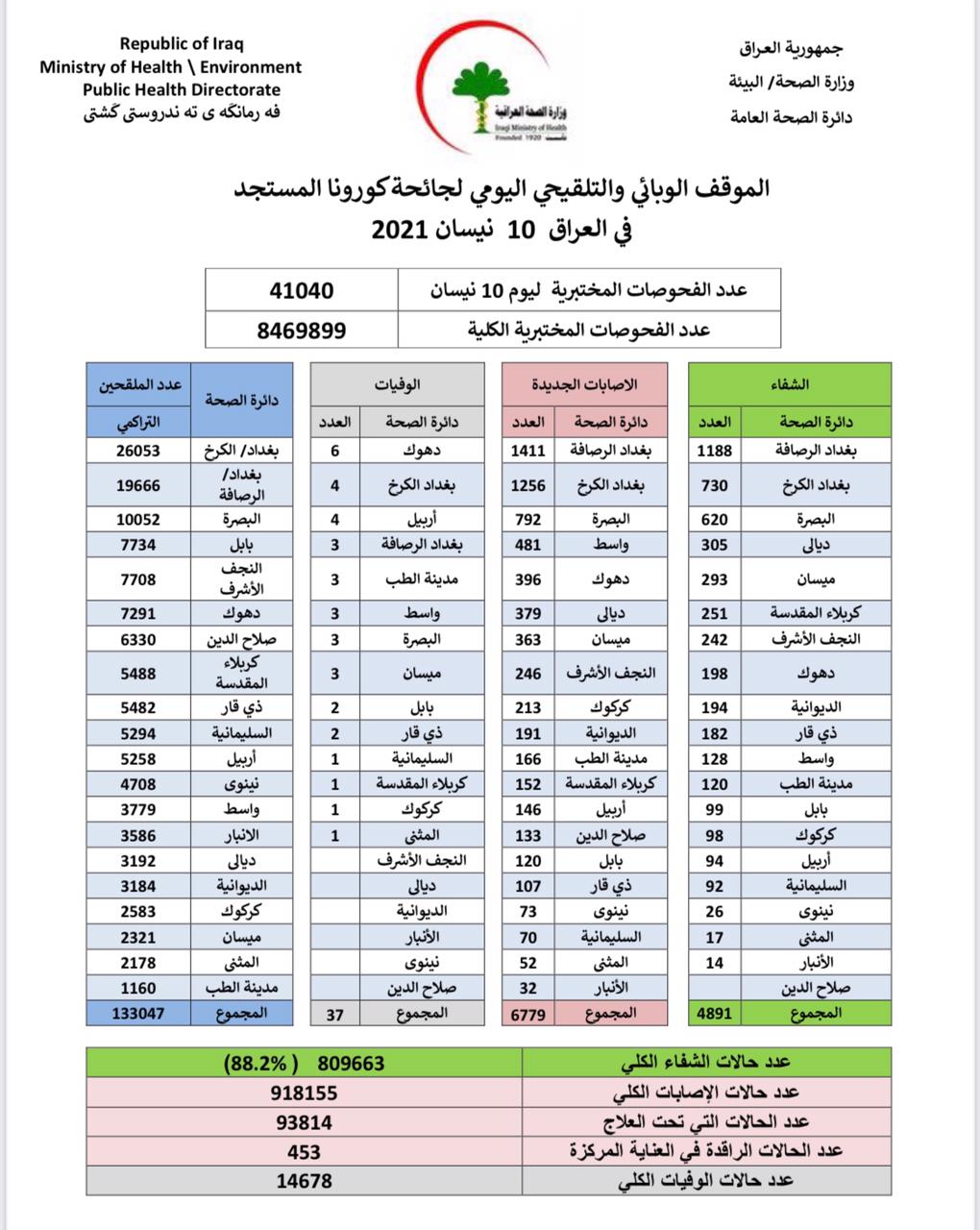 الصحة تعلن تسجيل 6779 اصابة جديدة بكورونا في عموم العراق